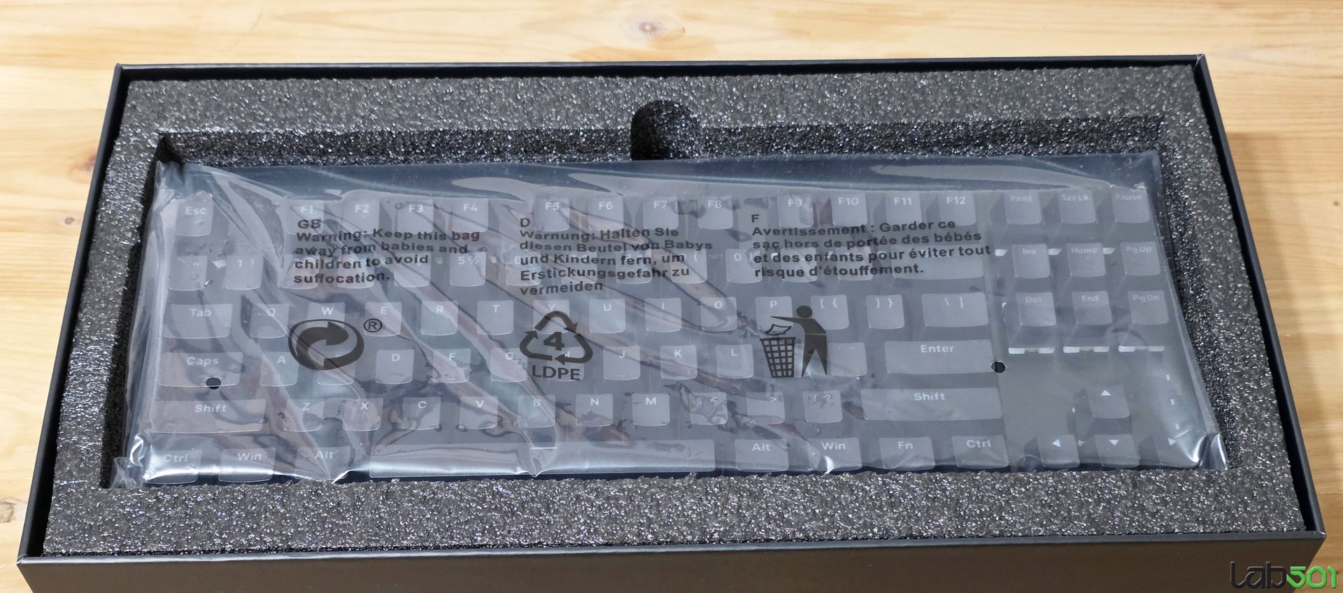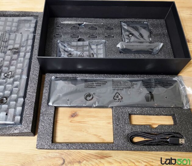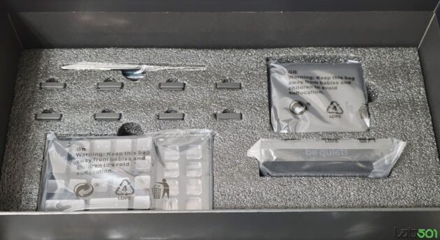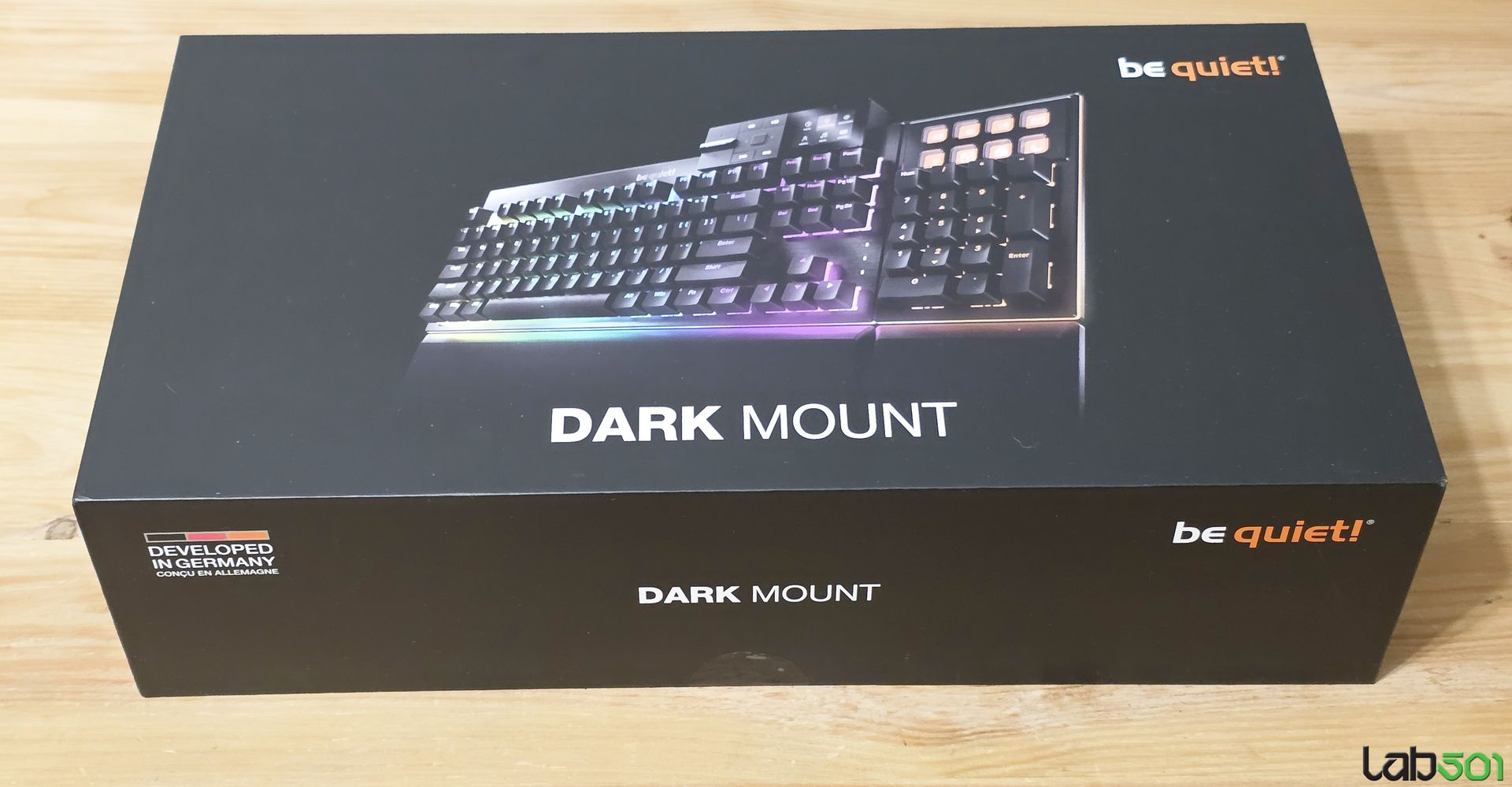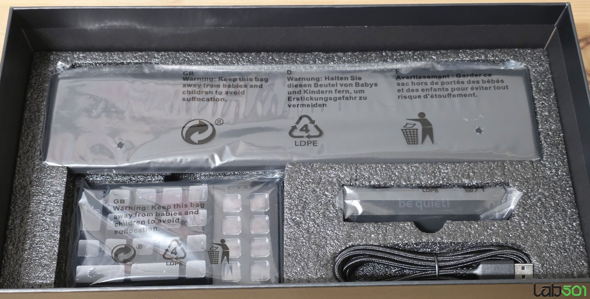be quiet! Dark Mount este livrata intr-un ambalaj elegant, de mari dimensiuni, in care gasim mai multe straturi de spuma de protectie, dispuse pe verticala. Primul etaj contine tastatura, al doilea etaj contine palm-rest-ul magnetic pentru tastatura si cablul USB, in timp ce in compartimentul inferior gasim NumPad-ul si palm-rest-ul magnetic dedicat, Media Dock-ul, un keycaps puller / switch puller si 8 picioruse magnetice pentru ajustarea unghiului de tastare.