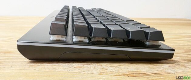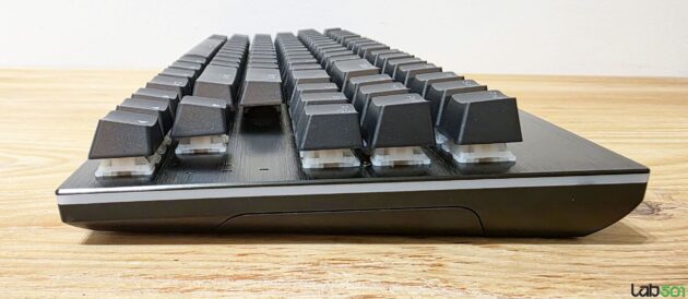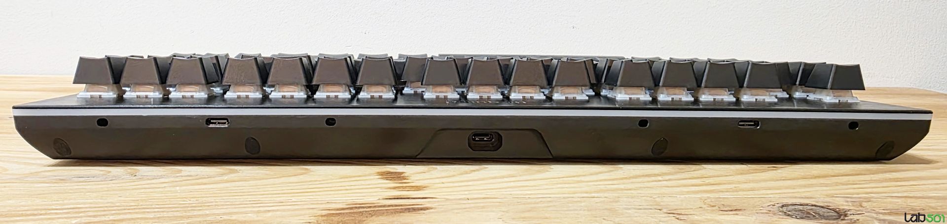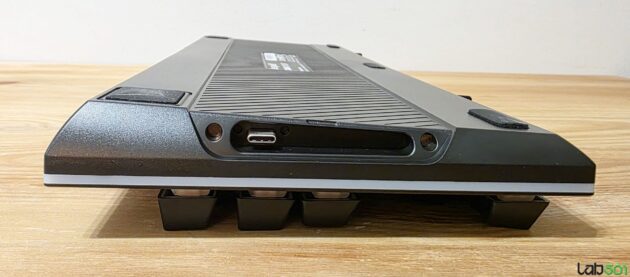 Pe fiecare laterala gasim un conector USB-C si 2 sisteme de fixare cu magneti, pentru atasarea NumPad-ului, acestea fiind acoperite implicit cu un capac de plastic. Pentru a atasa NumPad-ul, trebuie sa inlaturam capacul din plastic corespunzator laturii pe care vrem sa il atasam, atat de pe NumPad, cat si de pe tastatura, sistemul de ghidare culisant fiind montat pe NumPad.