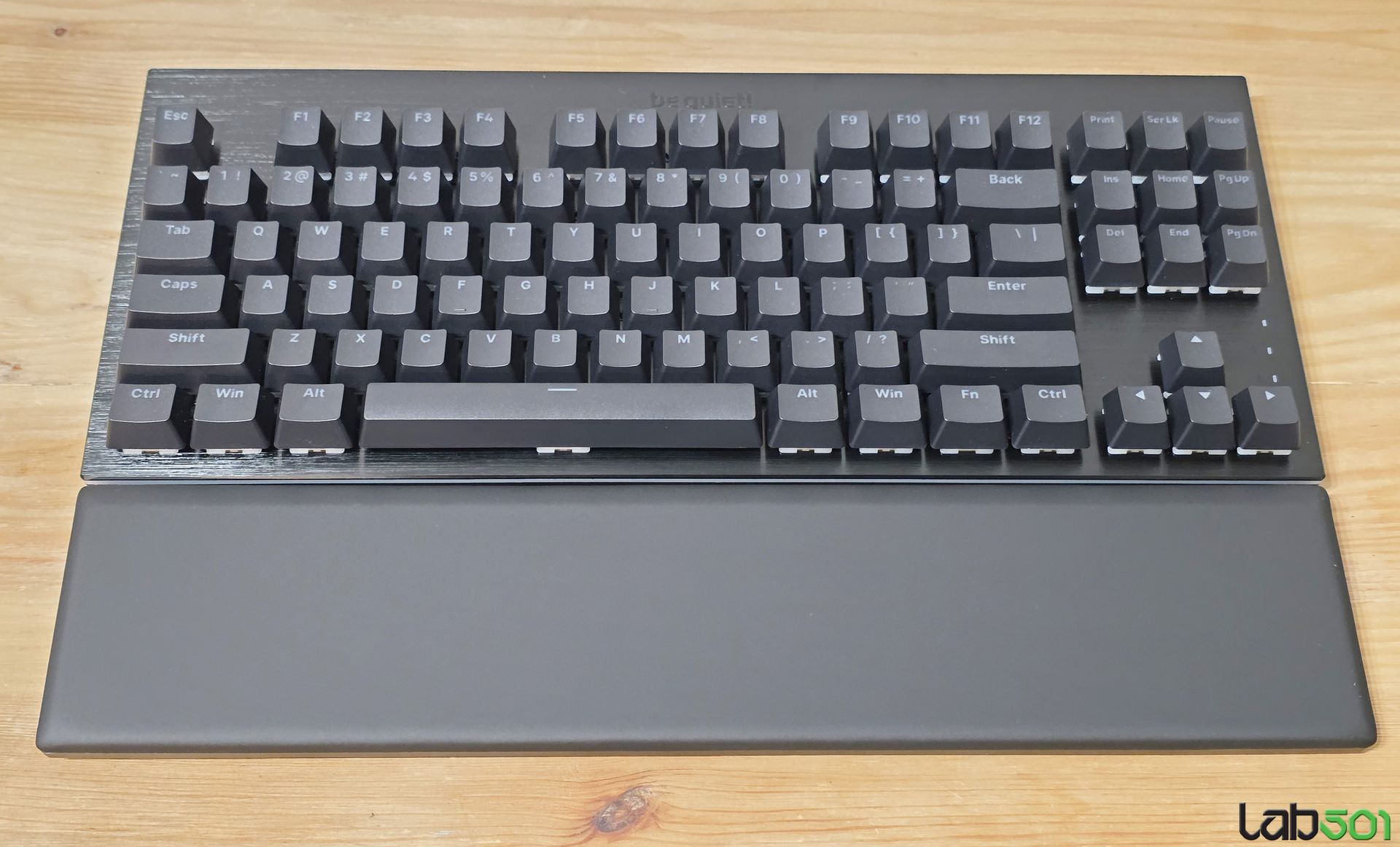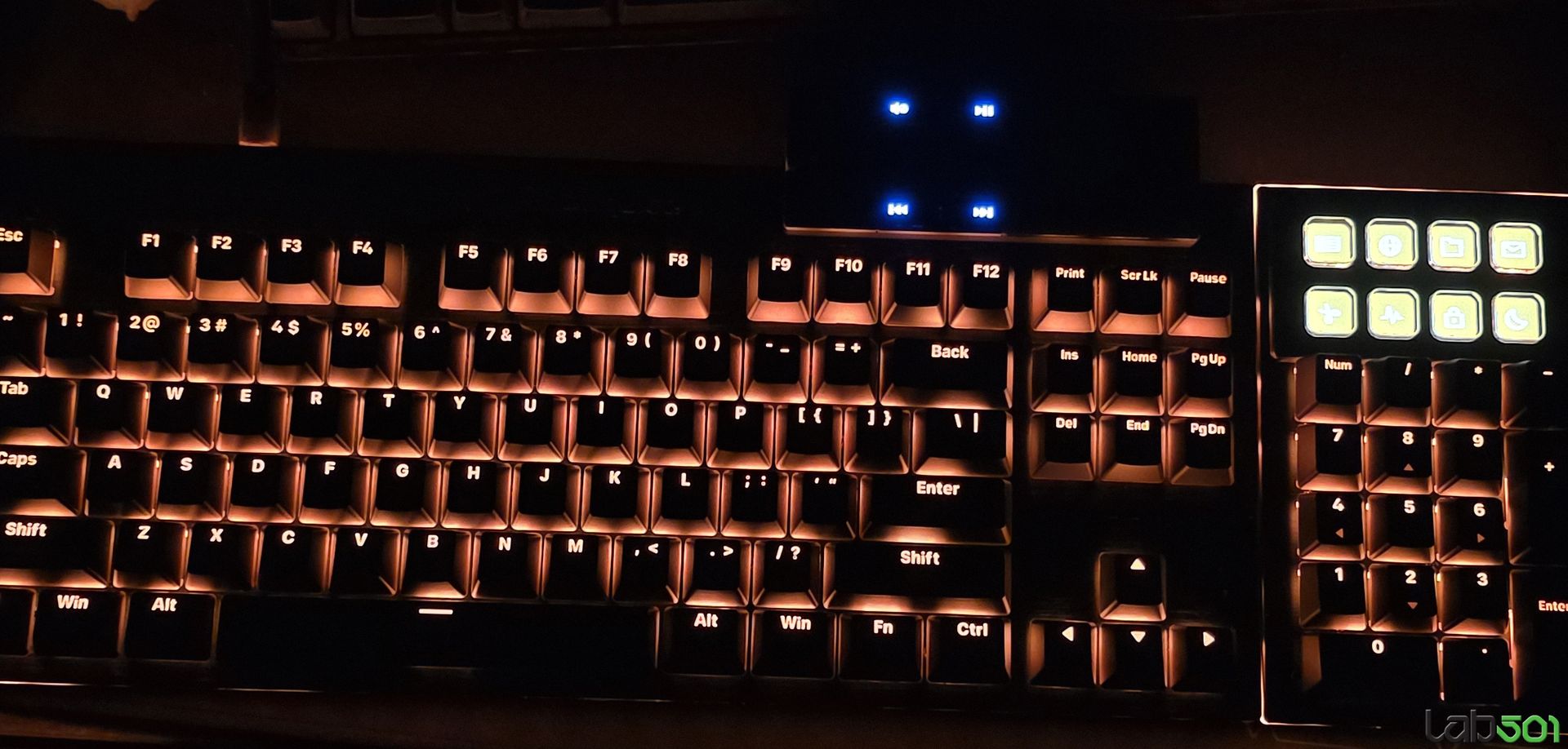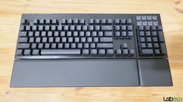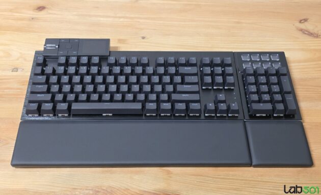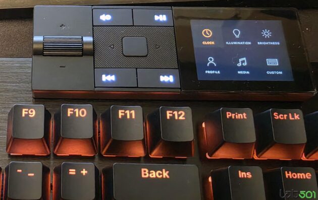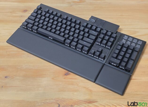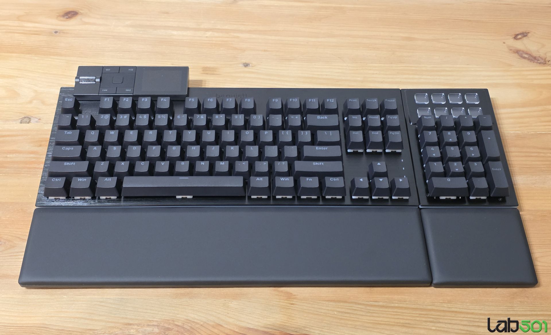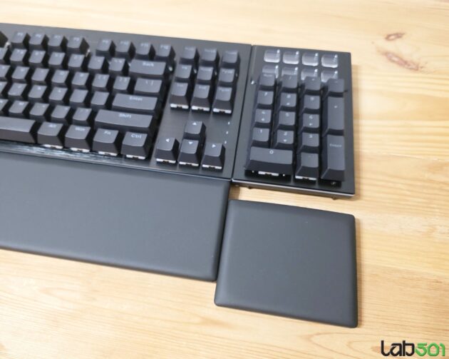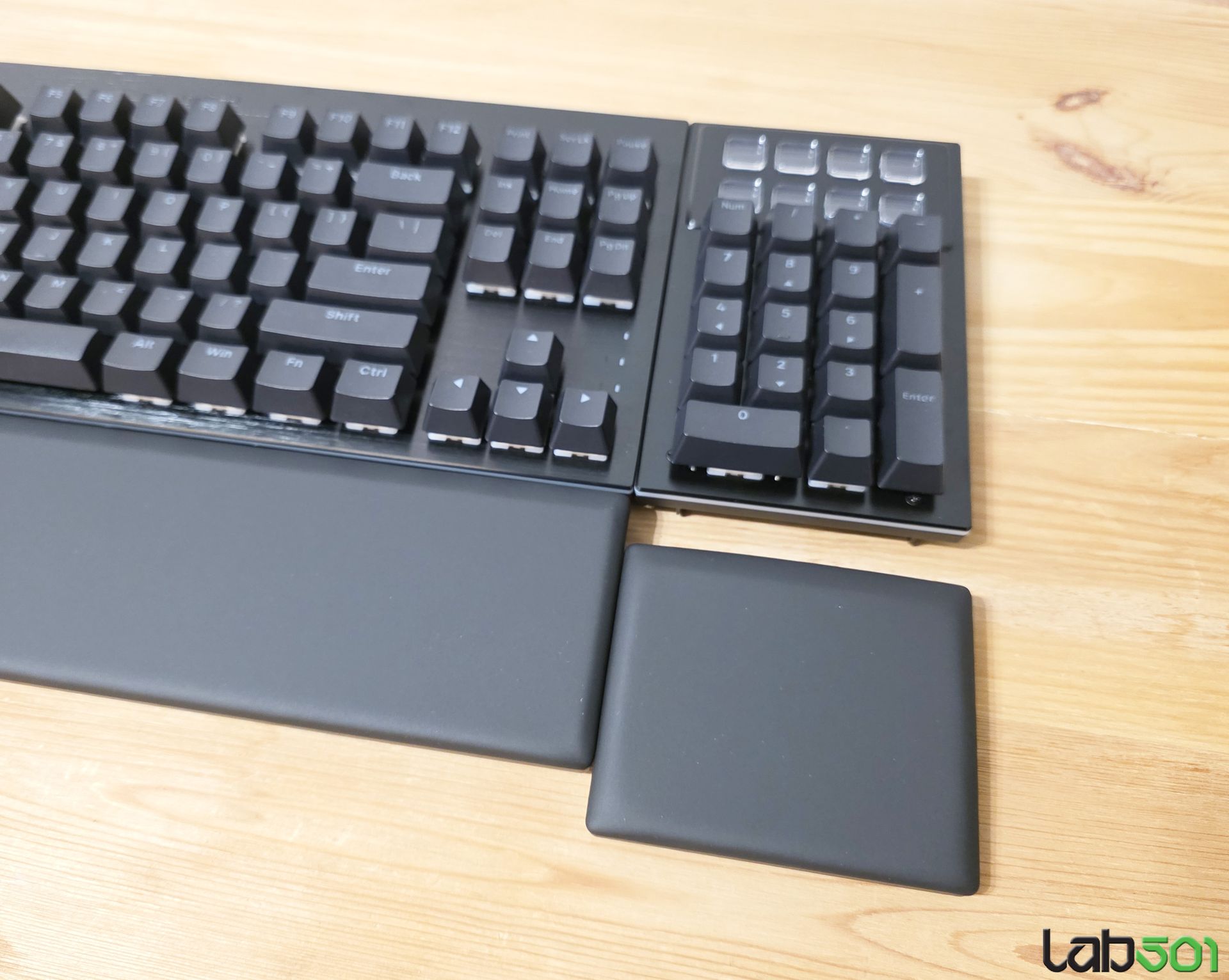 In pachet gasim un palm-rest construit din plastic, acoperit cu piele sintetica, acesta putand fi atasat cu ajutorul unor sisteme de prindere magnetice. NumPad-ul beneficiaza la randul sau de un palm-rest magnetic dedicat, indiferent pe care parte a tastaturii il atasam. La randul sau, Media Dock-ul este echipat cu rotita de volum, 4 taste cu functii predefinite, un grup de trei taste pentru navigare, respectiv un display LCD pe care putem afisa parametrii care ne intereseaza, respectiv o imagine statica.