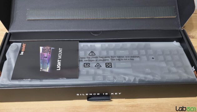 be quiet! Light Mount este livrata intr-un ambalaj ceva mai compact, in pachet fiind incluse tastatura, manaulul utilizatorului, cablul USB si un keycaps puller / switch puller. Aspectul tastaturii respecta limbajul estetic al seriei, cu top-plate-ul din aluminiu slefuit si carcasa construita din ABS, be quiet! Light Mount fiind o tastatura eleganta si destul de compacta pentru un model full.