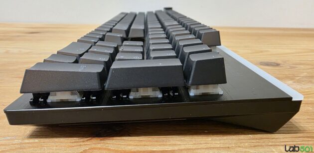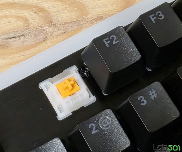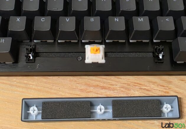Constructia este similara cu ceea ce vedem in cazul surorii mai mari, inclusiv cele 3 straturi de material fonoabsorbant, respectiv insertiile de spuma montate sub Spacebar. Practic, chiar daca avem de-a face cu doua formate complet diferite, senzatia avuta in timpul tastarii, respectiv amprenta sonora, sunt in linii mari identice.