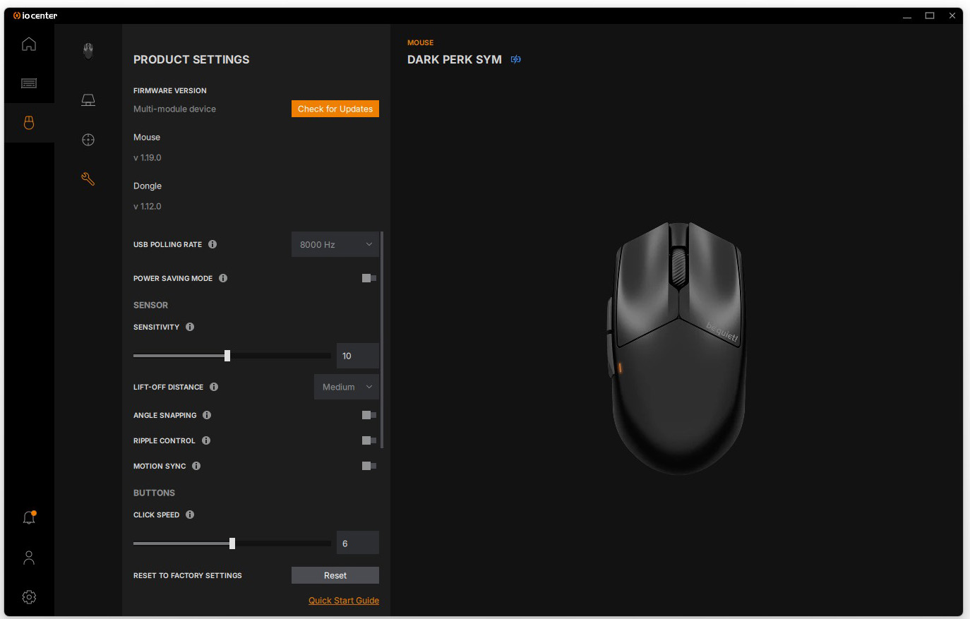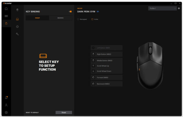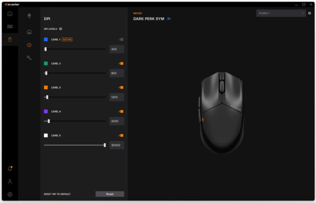 Desigur, pentru a selecta unul dintre cei 5 pasi predefiniti pentru sensibilitate avem la dispozitie un buton dedicat pe latura inferioara a mouse-ului, tot acolo fiind prezent si butonul cu ajutorul caruia comutam intre tipul de conexiune (wired sau wireless). Folosind IO Center putem sa personalizam insa in detaliu mouse-ul, aici fiind prezente setari pentru Lift Off Distance, Angle Snapping sau Click Speed.