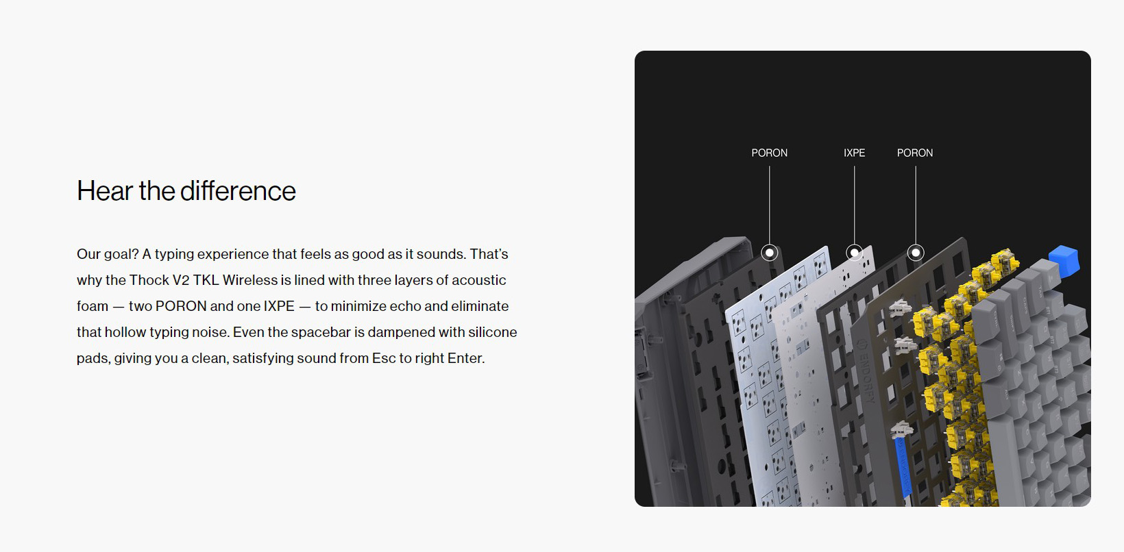 Merita mentionat faptul ca producatorul a folosit 3 straturi de material fonoabsorbant, doua din Poron si unul din IXPE, acestea flancand practic PCB-ul. De asemenea, sub Spacebar gasim o insertie din silicon, care confera acestei taste un sunet jos, infundat, pe masura numelui seriei.