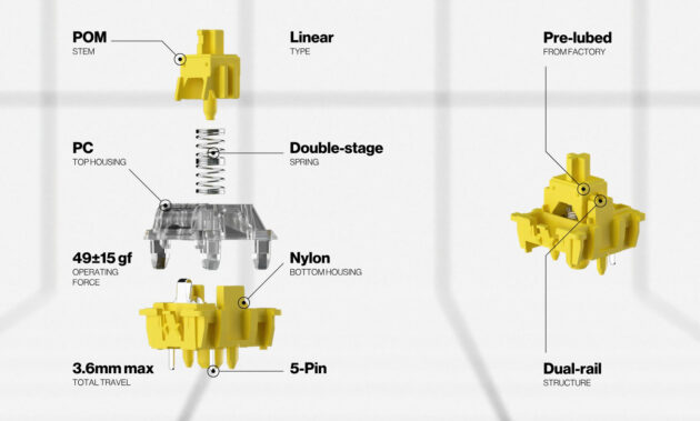 Switch-urile ENDORFY Yellow by Gateron sunt switch-uri liniare dual rail, o distanta de actuare de 2mm, cu o cursa totala de 3.6mm, pentru actuare fiind necesara o forta de 49g, in timp ce pentru o cursa completa este necesara o forta de 60g. Discutam de switch-uri lubrifiate din fabrica, cu stem-ul construit din POM, carcasa superioara din policarbonat si carcasa inferioara din Nylon, echipate cu 5 pini.