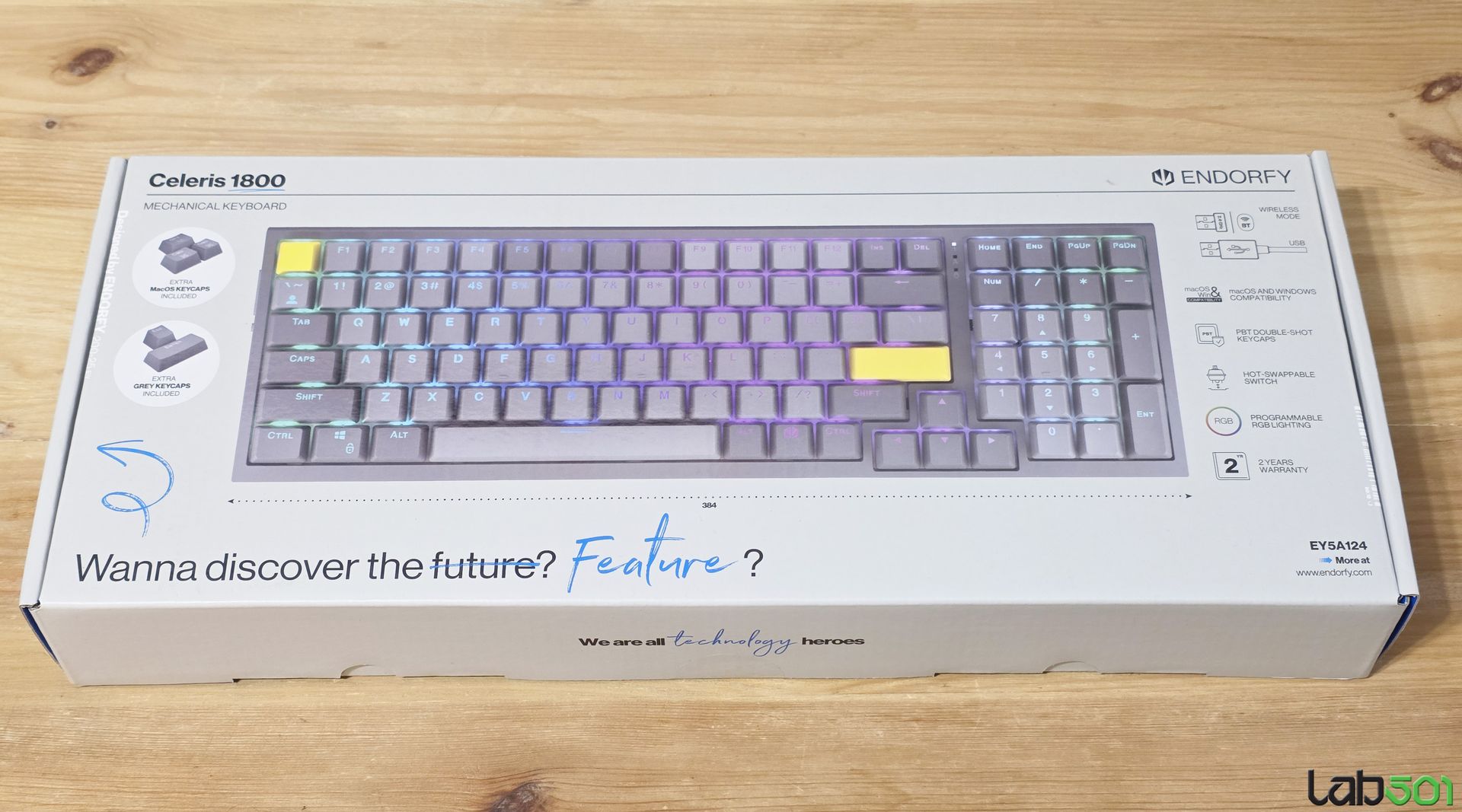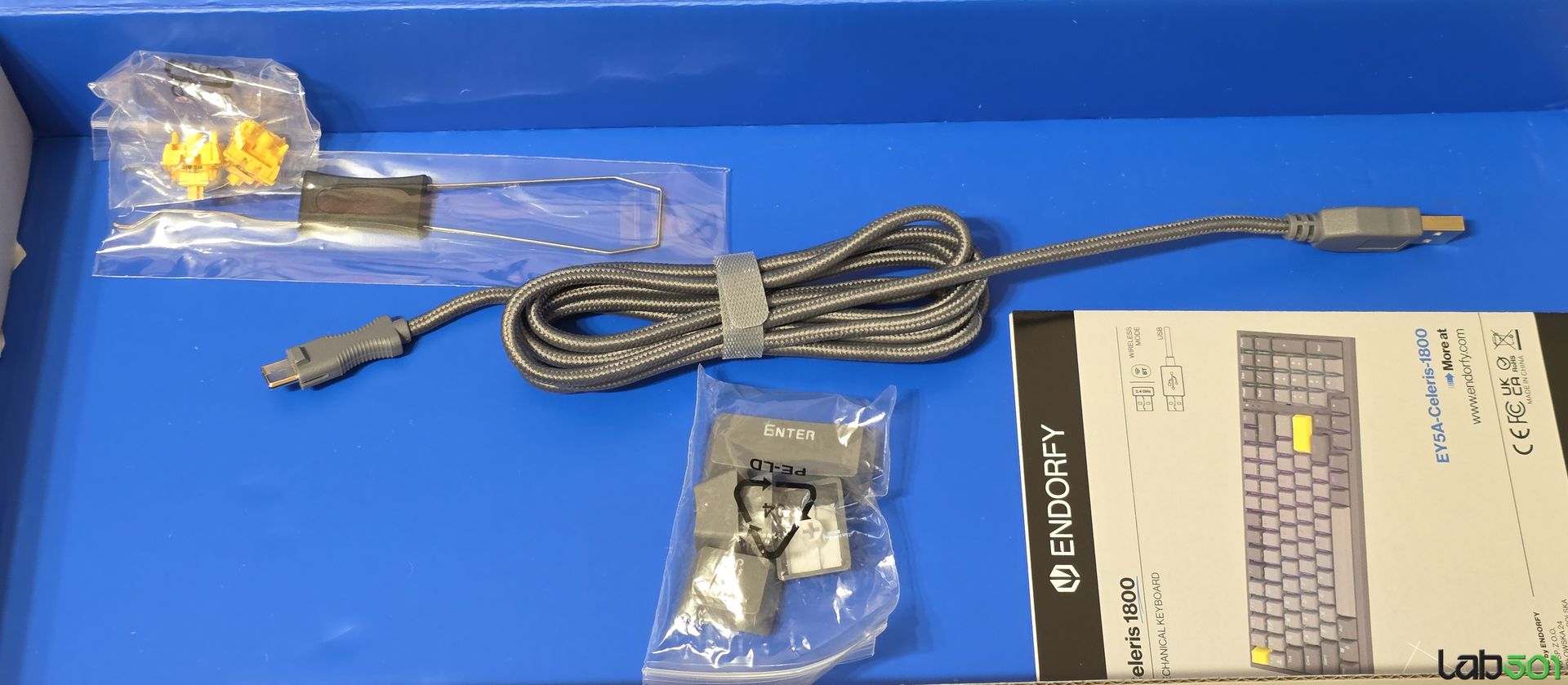 ENDORFY Celeris 1800 este livrata intr-un ambalaj elegant, in pachet fiind inclusa tastatura gata asamblata, cablul detasabil, un keycaps puller / switch puller, manualul utilizatorului, 2 switch-uri de rezerva si 2 keycaps-uri gri, pentru cei care nu agreeaza insertiile albastre si 2 keycaps-uri pentru MacOS. De asemenea, pe spatele tastaturii gasim un keycaps puller si dongle-ul wireless.