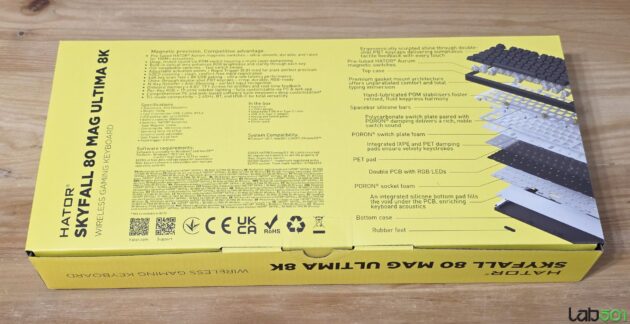Hator Skyfall 80 MAG Ultima 8K Wireless este livrata in ambalajul viu colorat specific producatorului, in pachet fiind incluse tastatura, un ghid rapid, un keycap/switch puller, cablul detasabil, material fonoabsorbant pentru tasta Space, un keycap roz si un set de sticker-e Hator. Cablul matisat este invelit intr-un material extrem de moale, cablul fiind foarte usor si flexibil.