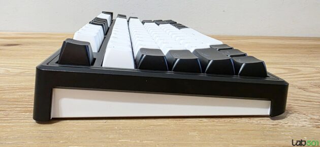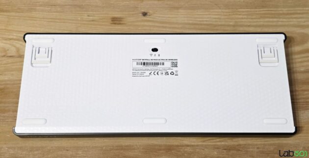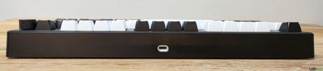 Unghiul de tastare poate fi ajustat cu ajutorul celor doua picioare rabatabile, tastatura fiind echipata cu 6 insertii de cauciuc pentru o mai buna stabilitate pe birou, indiferent de suprafata. Pe latura inferioara a tastaturii gasim si butonul cu ajutorul caruia putem comuta intre cele trei moduri de functionare, conectorul USB-C fiind montat pe partea din spate.