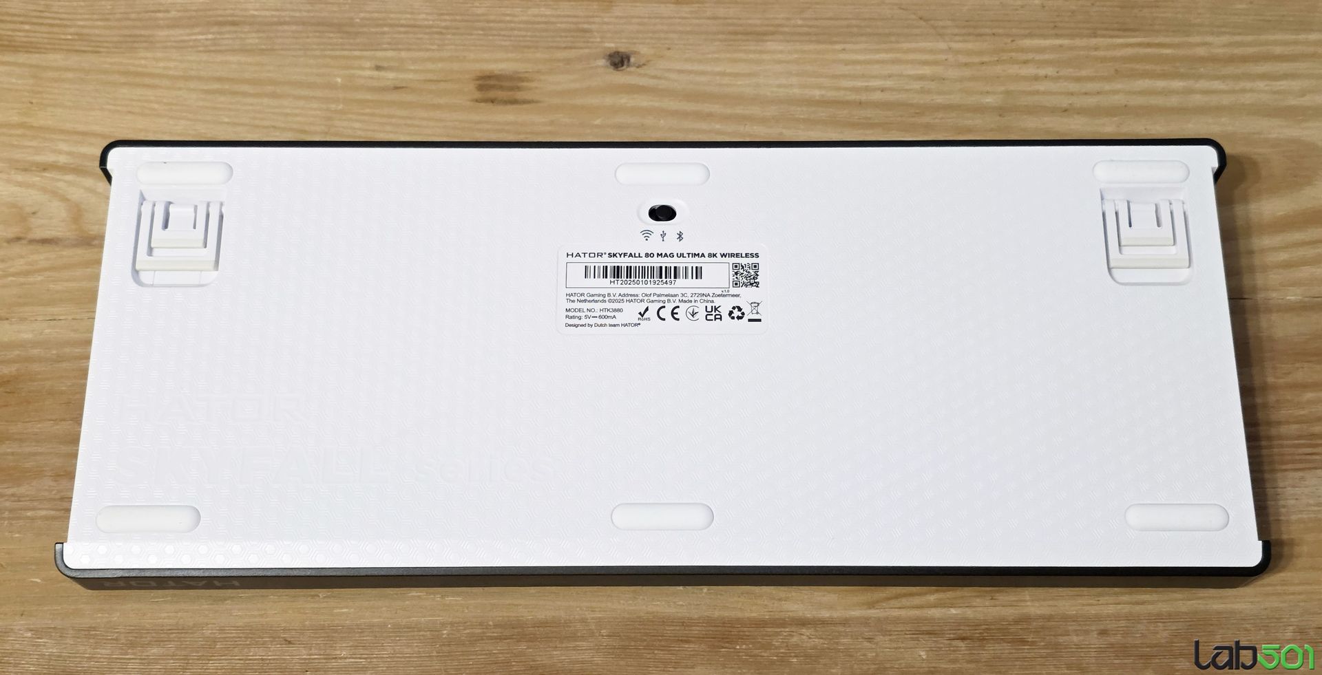 Hator Skyfall 80 MAG Ultima 8K Wireless este o tastatura compacta, carcasa fiind alcatuita dintr-o baza de plastic, peste care sunt montate 4 straturi de material fonoasborbant (silicon, poron, spuma si IPXE), PCB-ul hot swappable, inca un strat din poron, plate-ul din PC si capacul superior al tastaturii.