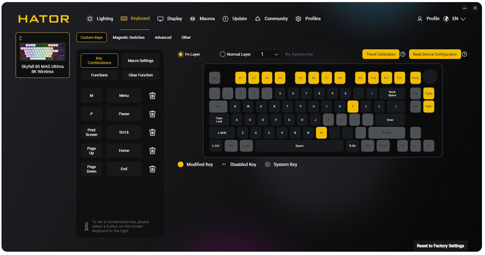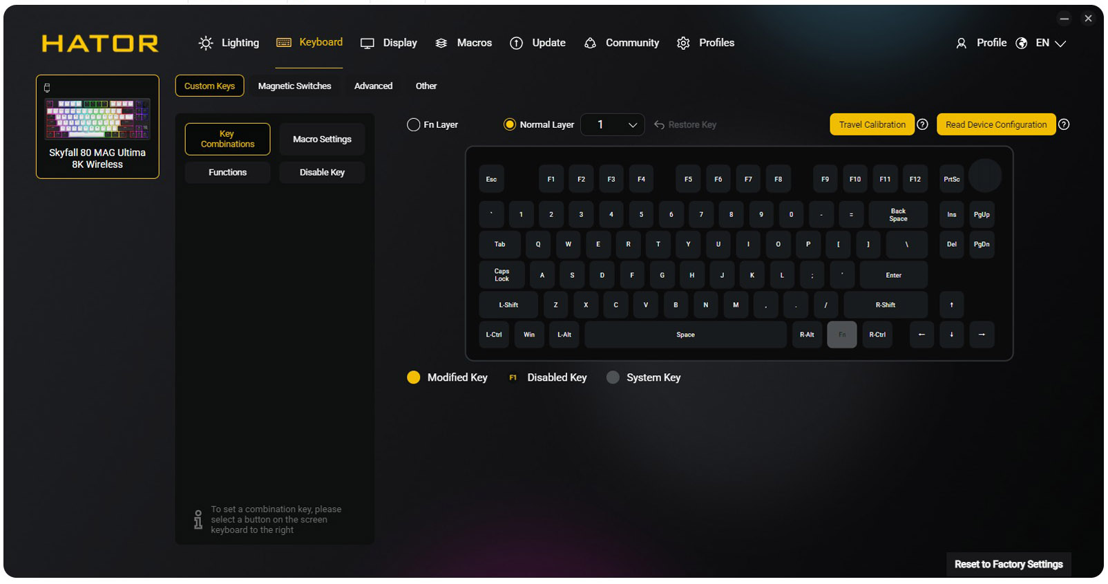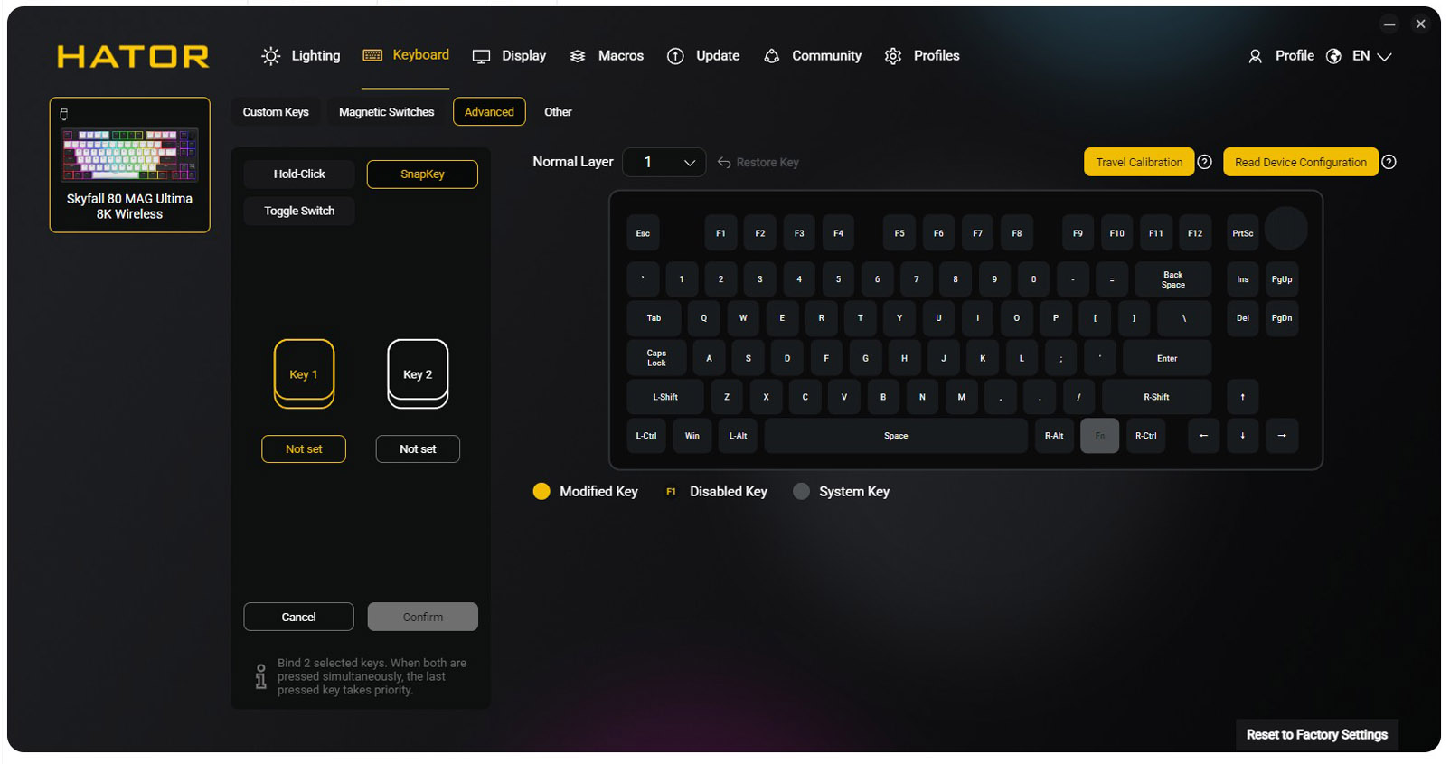 Din acest motiv, in cazul tastaturilor magnetice utilitarul pus la dispozitie de producator joaca un rol mult mai important decat in cazul tastaturilor mecanice clasice. In cazul de fata, discutam despre Hator SyncHUB, un utilitar complex, care ne permite sa programam tastatura in orice mod ne dorim, sa definim layer-e, sa alocam orice functii dorim oricarei taste, s.a.m.d.