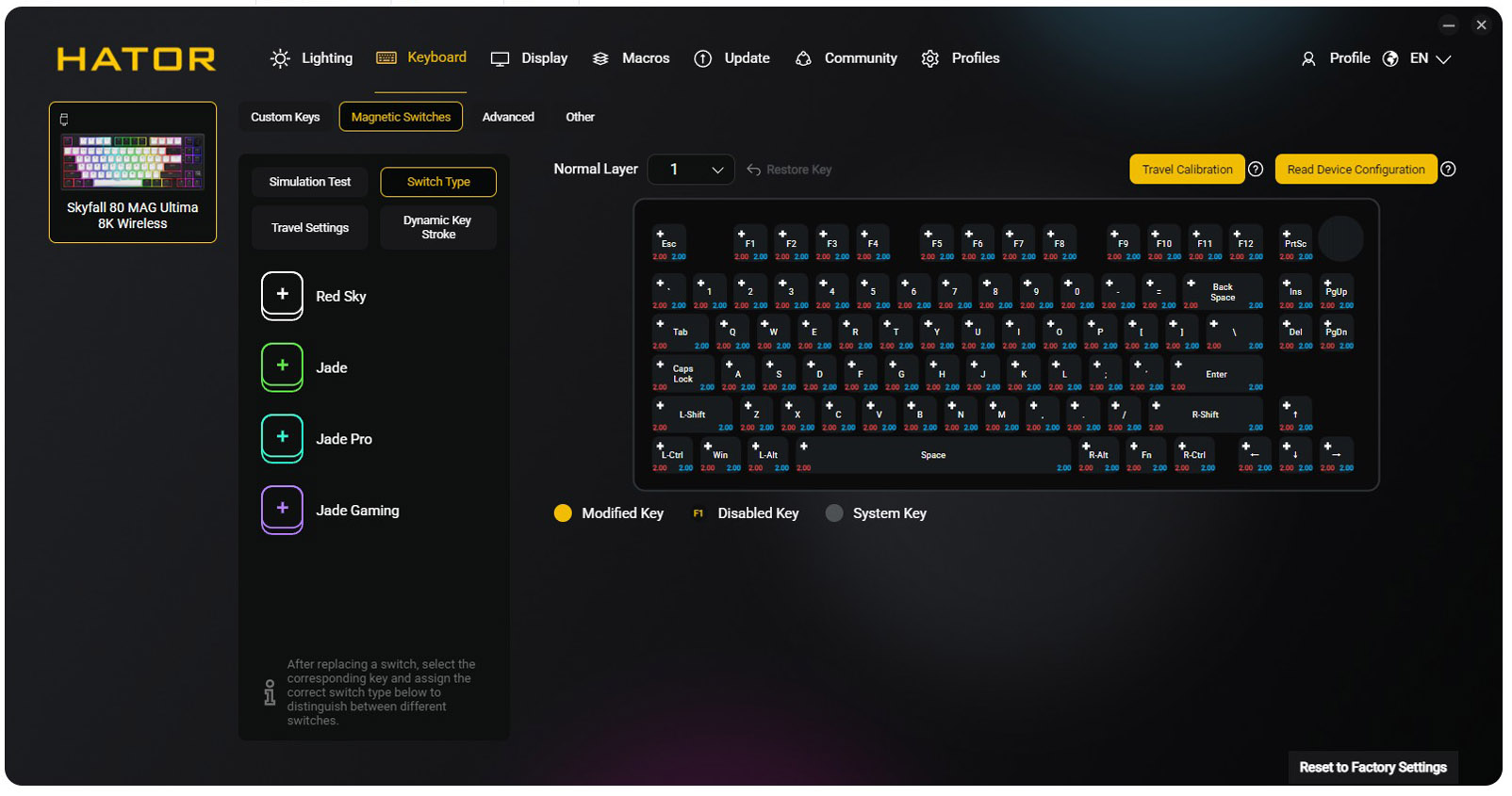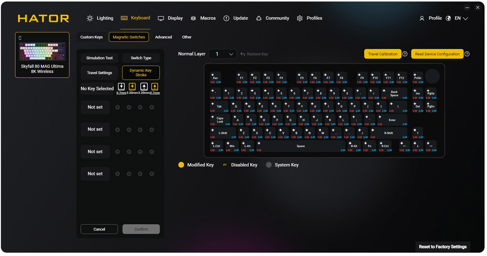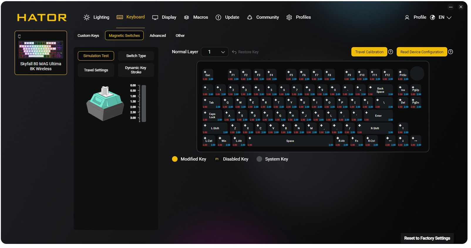 Mai mult decat atat, tot aici putem seta sau calibra functiile specifice tastaturilor magnetice, putem regla iluminarea, putem defini macro-uri si putem personaliza comportamentul fiecarui switch in parte. Si trebuie sa recunosc, de obicei nu ma dau in vant dupa utilitarele puse la punct de producatori, dar in cazul de fata chiar avem de-a face cu o aplicatie utila, bine la pusa la punct, potrivita chiar si pentru cei mai pretentiosi dintre noi.