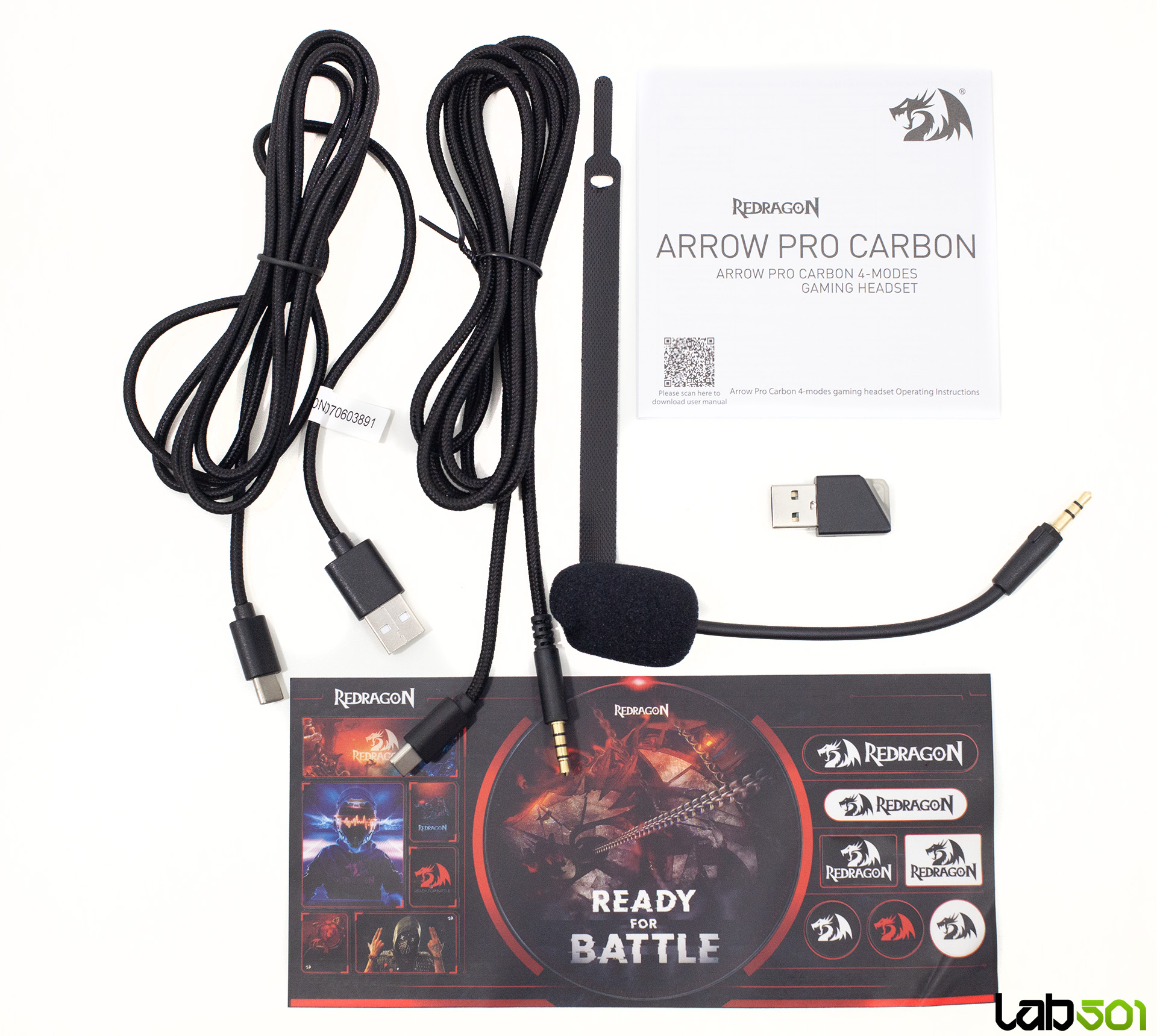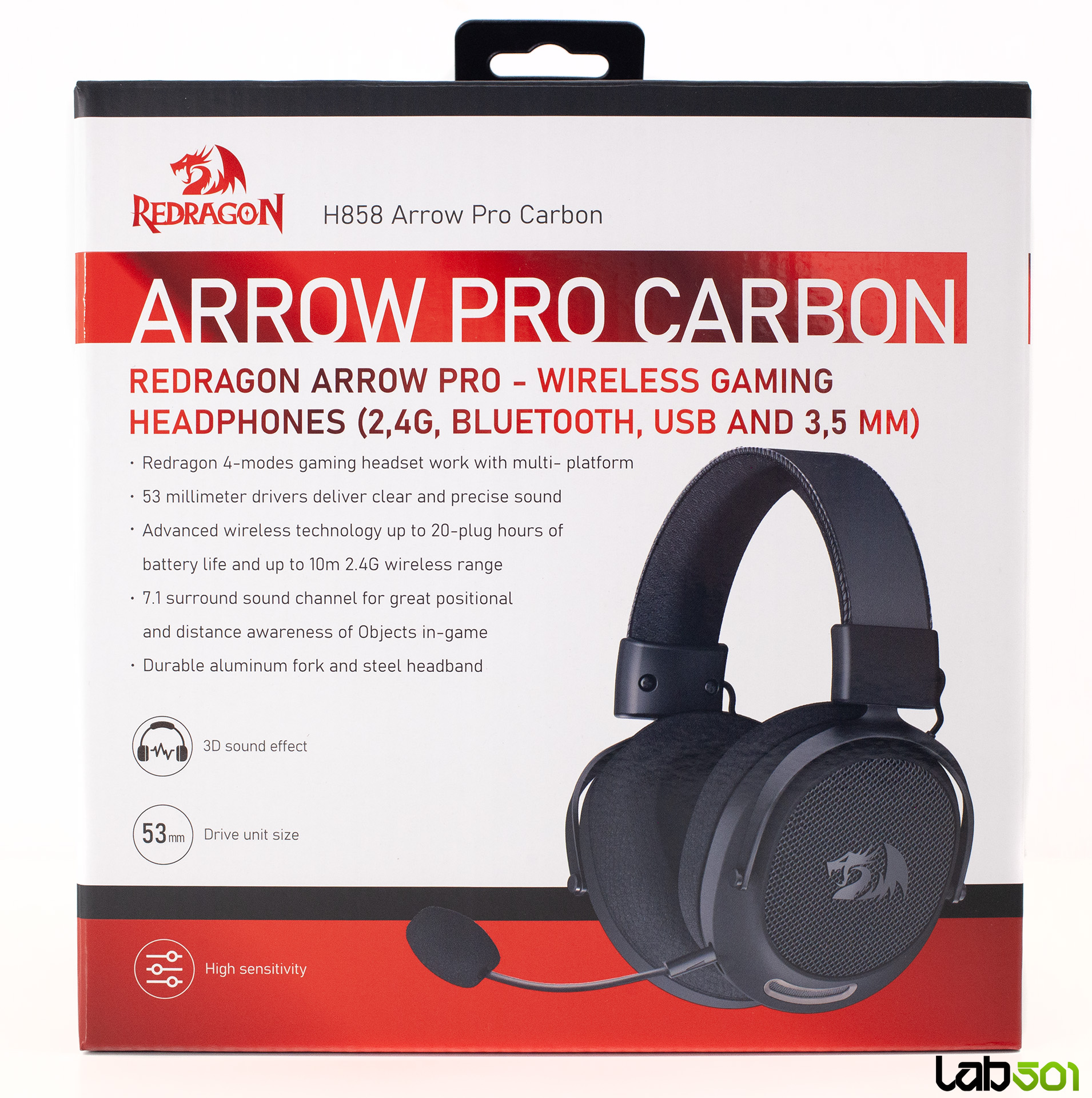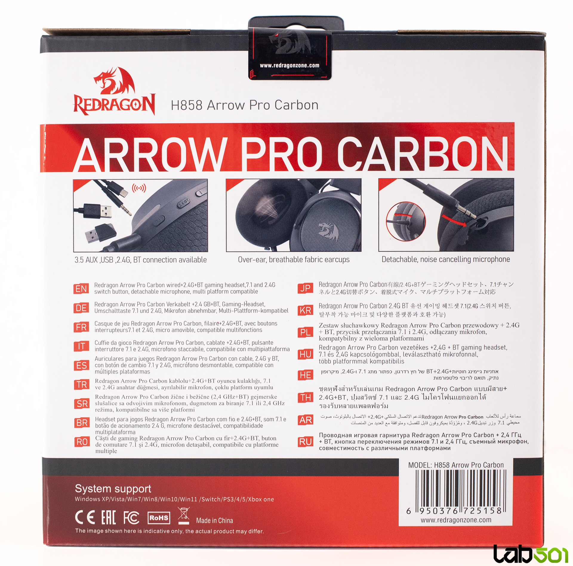 Redragon livreaza castile Arrow Pro Carbon intr-o cutie din carton lucios in nuante de negru si rosu, cu imaginea produsului pe fata si lista principalelor specificatii pe spate. In interior, castile sunt fixate intr-un suport din plastic, iar cupele si banda sunt protejate pentru a preveni zgarieturile in timpul transportului. Continutul pachetului este generos pentru aceasta categorie de pret si include castile Redragon H858 Arrow Pro Carbon, microfonul detasabil cu pop-filter preinstalat, dongle-ul USB wireless 2.4 GHz si cablul USB-A la USB-C de aproximativ 2 metri (utilizabil atat pentru incarcare, cat si pentru utilizarea in modul wired).