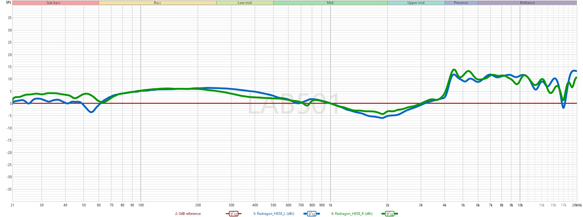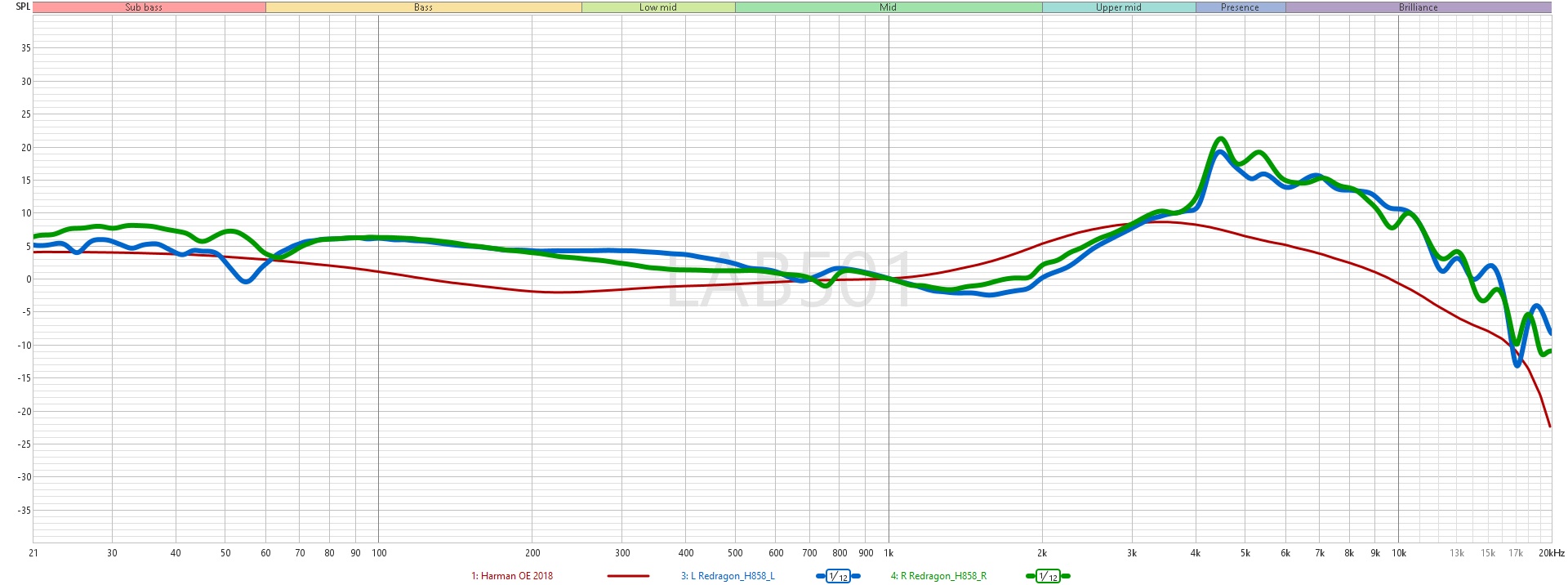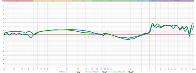 Fiind un model wireless, Redragon H858 Arrow Pro Carbon a fost testat in modul 2.4 GHz, folosind dongle-ul inclus. Ca reper, prima reprezentare grafica prezinta curba de referinta Harman (2018) marcata cu rosu, in timp ce raspunsul castilor este afisat pentru canalul drept (verde) si cel stang (albastru). Fireste, natura subiectiva a perceptiei sonore, impreuna cu diferentele anatomice individuale, trebuie avute in vedere in interpretarea rezultatelor. Pentru o analiza mai usor de interpretat, al doilea grafic arata diferenta dintre raspunsul castilor si curba Harman, exprimata in dBr (diferenta fata de nivelul de referinta), evidentiind abaterile pe intreg spectrul de frecvente.