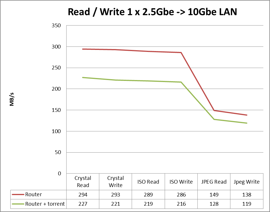 Primul test in mod 2.5Gbe satureaza latimea de banda a retelei, singurul test in care vedem performanta NAS-ului (procesor / RAM) fiind cel de copiere pentru fisiere de mici dimensiuni, respectiv cel de copiere simultan cu descarcarea unui torent.
