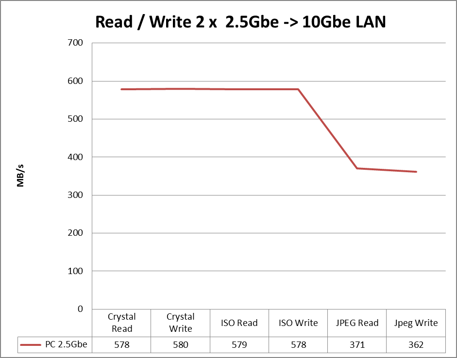 Mai interesant insa este faptul ca cele doua conexiuni 2.5Gbe ale NAS-ului pot fi agregate, drept urmare am conectat NAS-ul direct la placa noastra de baza folosind cabluri CAT 8 SSTP si am rulat suita initiala alcatuita din cele trei teste.