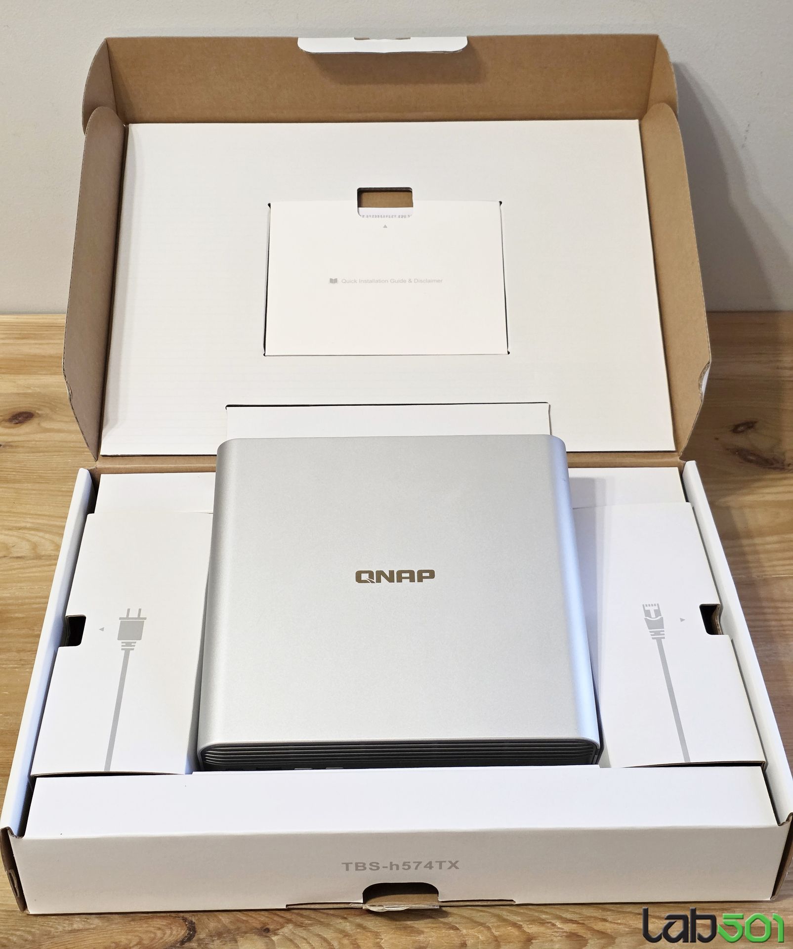 NAS-ul este livrat intr-o cutie din carton, in pachet fiind inclus un cablu RJ-45, alimentatorul la priza si manualul utilizatorului. In cazul de fata nu gasim heatsink-uri pentru SSD-uri NVMe incluse in pachet, drept urmare, este recomandabil sa achizitionati SSD-uri echipate deja cu heatsink, a carui grosime sa nu depaseasca 4.5mm.