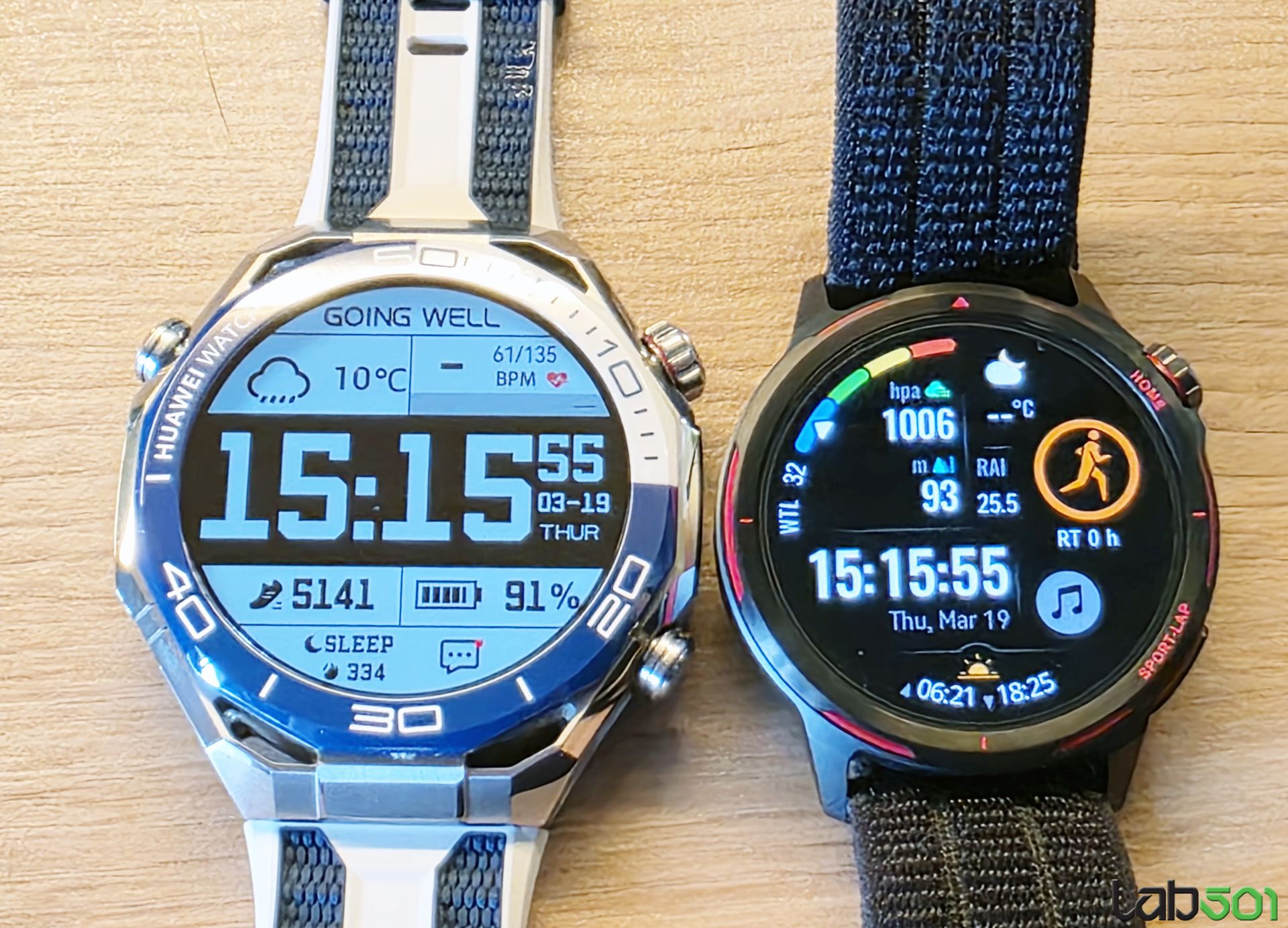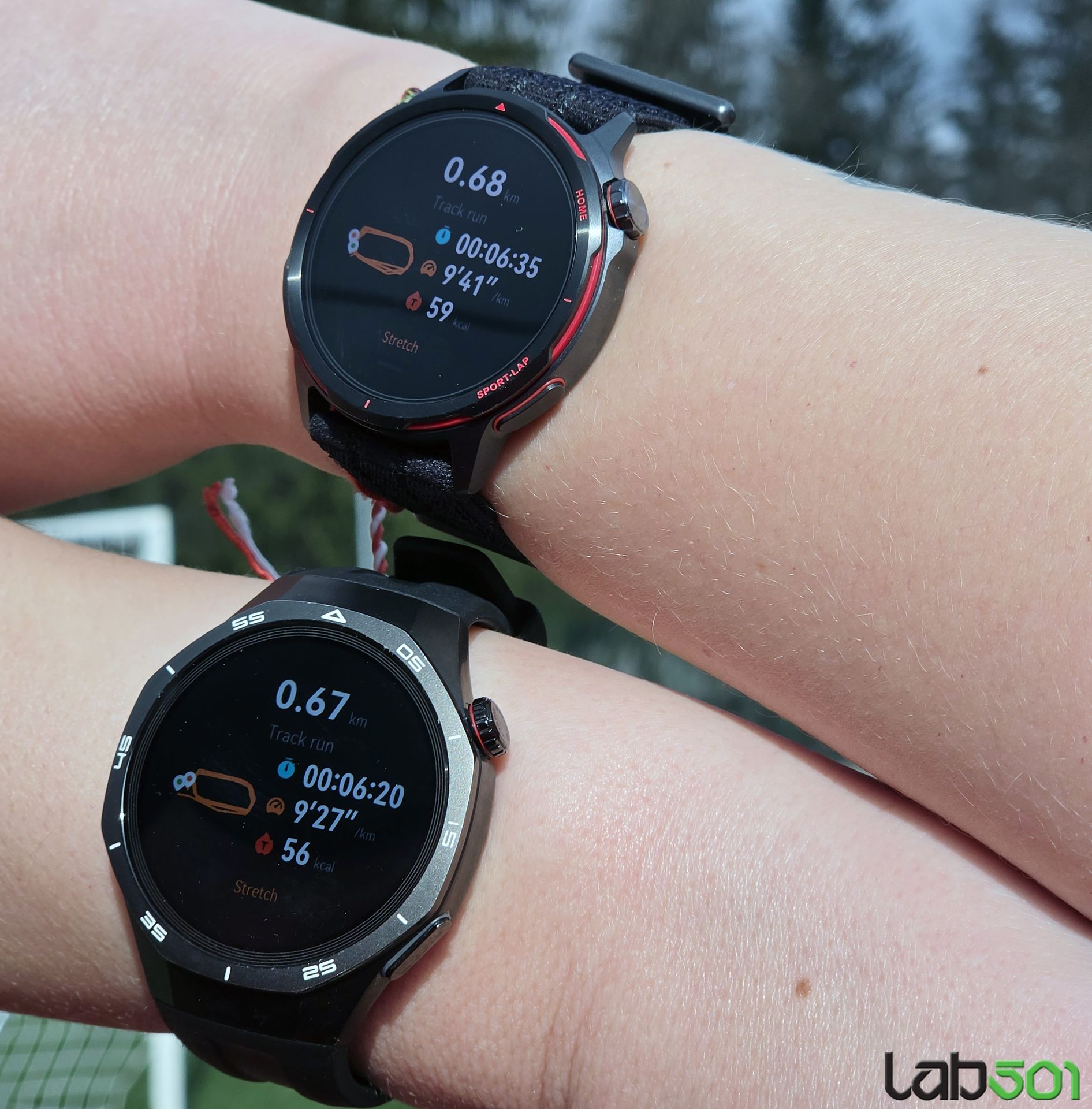 HUAWEI WATCH GT Runner 2 foloseste un acumulator “high-silicon stacked battery”, cu densitate crescuta, cei 540 mAh fiind suficienti pentru 14 zile de utilizare normala, sau 32 de ore de utilizare in mod continuu (monitorizarea a 5 maratoane consecutive). Autonomia este destul de impresionanta, daca luam in calcul dimensiunile reduse. De exemplu, mai jos puteti vedea cum arata HUAWEI WATCH GT Runner 2 prin comparatie cu Ultimate 2, repectiv GT5 Pro.