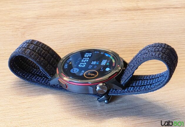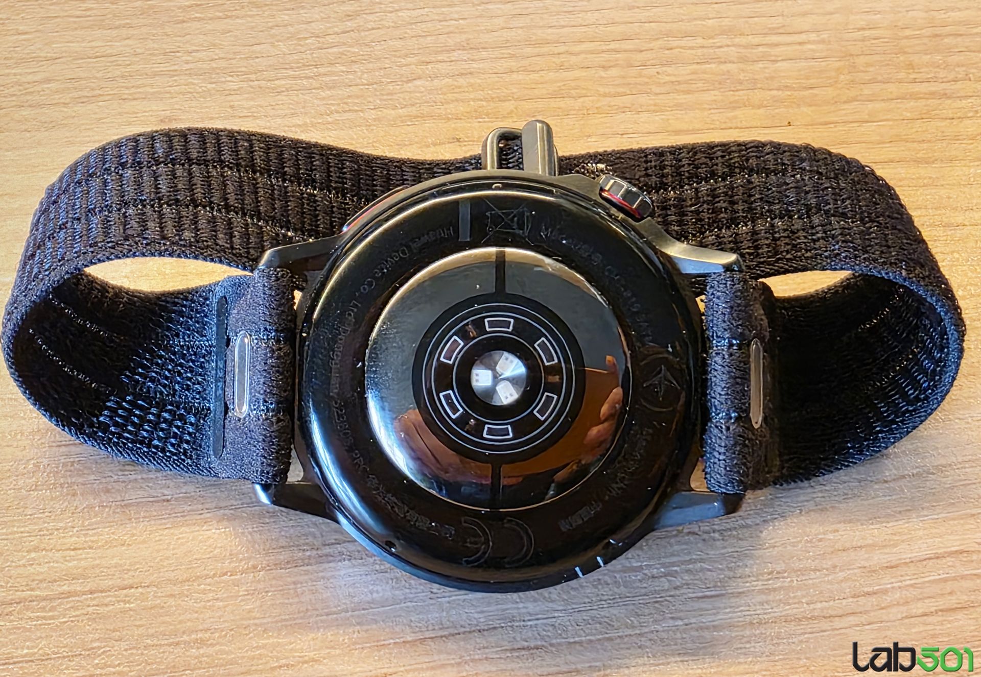 Constructia este specifica ceasurilor HUAWEI, in partea din dreapta sus fiind pozitionat butonul rotativ in forma de coroana ce poate fi actionat prin rotire sau apasare, iar in partea de jos gasim butonul plat, programabil, folosit de asemenea pentru functia EKG. Intre cele doua butoane, pe partea de ceramica, se afla pozitionat difuzorul, iar pe partea din spate sunt pozitionate cele 9 diode ale sistemului HUAWEI TruSense.