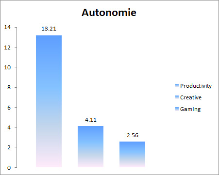Pentru a evalua autonomia am testat mai intai un scenariu de utilizare indelungata (Productivity din PowerMark) cu profilul Power Saver in Windows, luminozitate 50% si Wi-Fi on. Acest test simuleaza tipul de lucru office prin browsing si aplicatii office (Word, Excel). Apoi am rulat PCMark 8 Creativity, cu luminozitatea 100%, profil High Performance si WiFi On. Nu in ultimul rand, m-am jucat World Of Tanks cu aceleasi setari. Toate testele au fost lansate cu bateria la 100%, finalizarea testului facandu-se in momenul in care bateria se descarca in proportie de 81-84%.