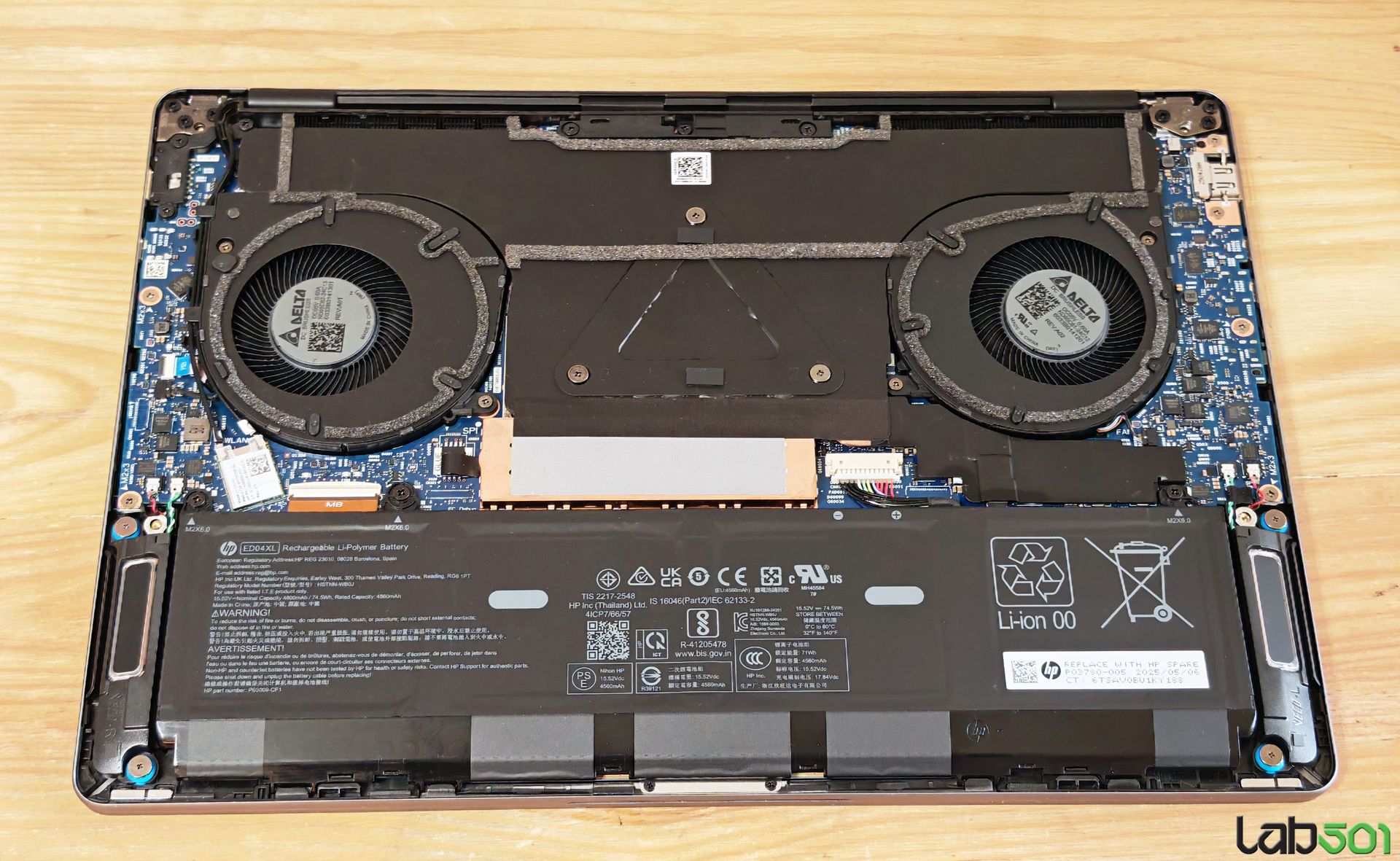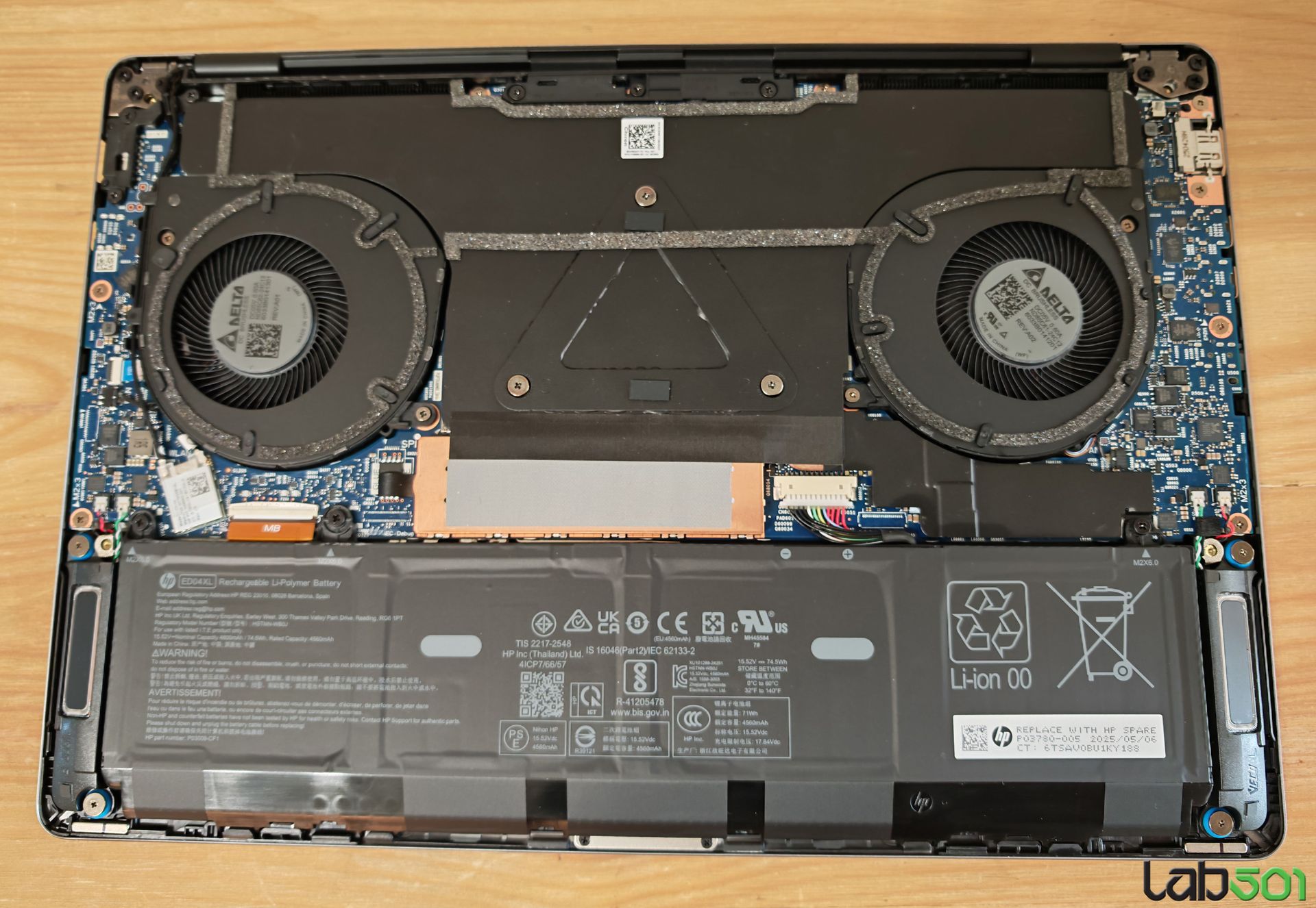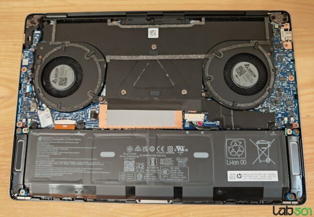 Cele doua ventilatoare centrifugale dispuse in stanga si in dreapta APU-ului trag aer rece prin latura inferioara a carcasei si il imping prin cele doua radiatoare, dar si peste vapor chamber, inspre latura din spate a notebook-ului. Sistemul de racire poarta denumirea HP Vaporforce Thermals.
