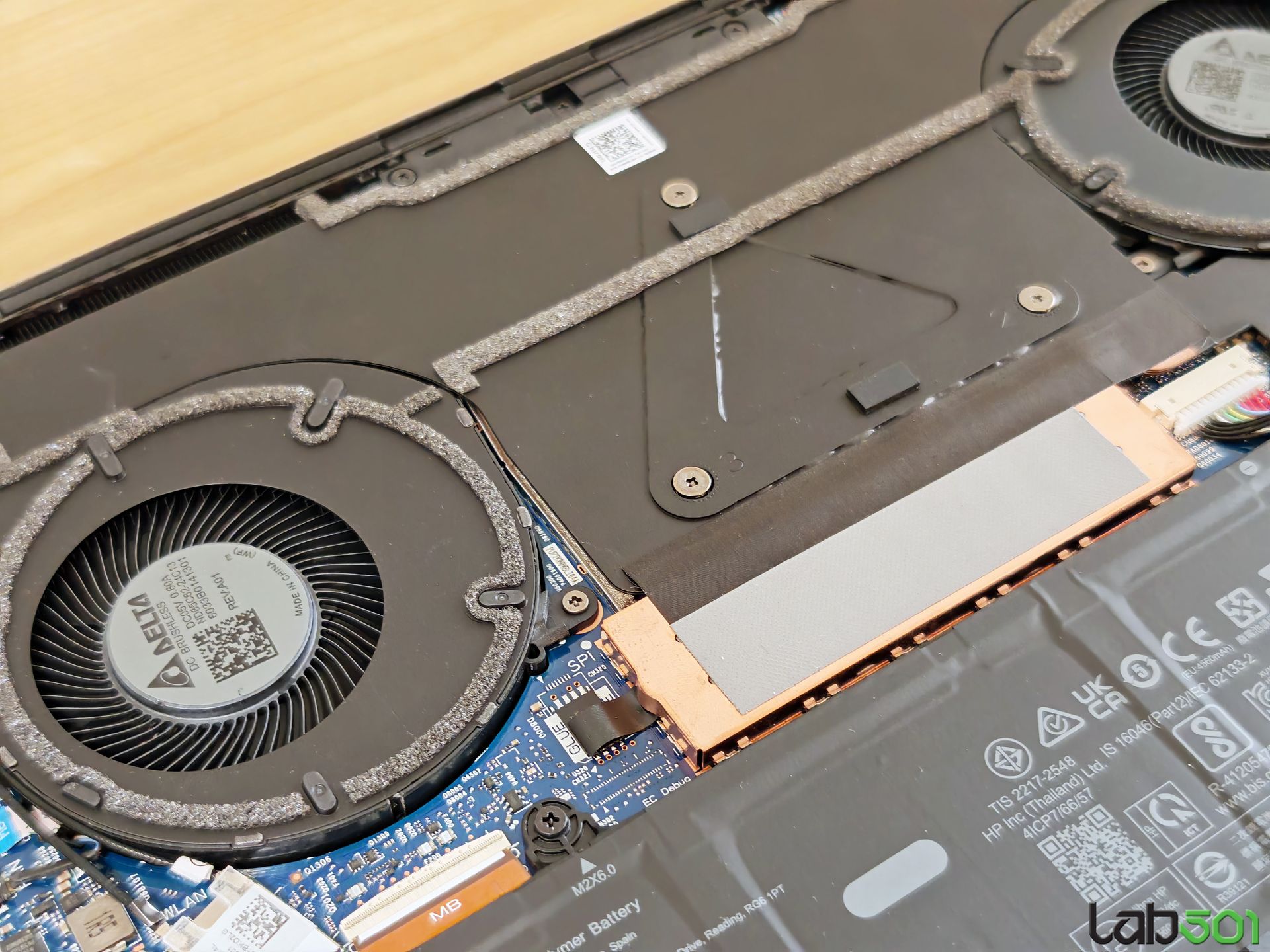 APU-ul este pozitionat in mijlocul placii de baza, fiind flancat de memoria lipita de PCB (latura inferioara si laterale), respectiv etajul de alimentare, dispus pe latura superioara. Toate acestea sunt acoperite de un vapourchamber de dimensiuni respectabile, care transmite caldura catre doua radiatoare dispuse in partea din spate a notebook-ului.