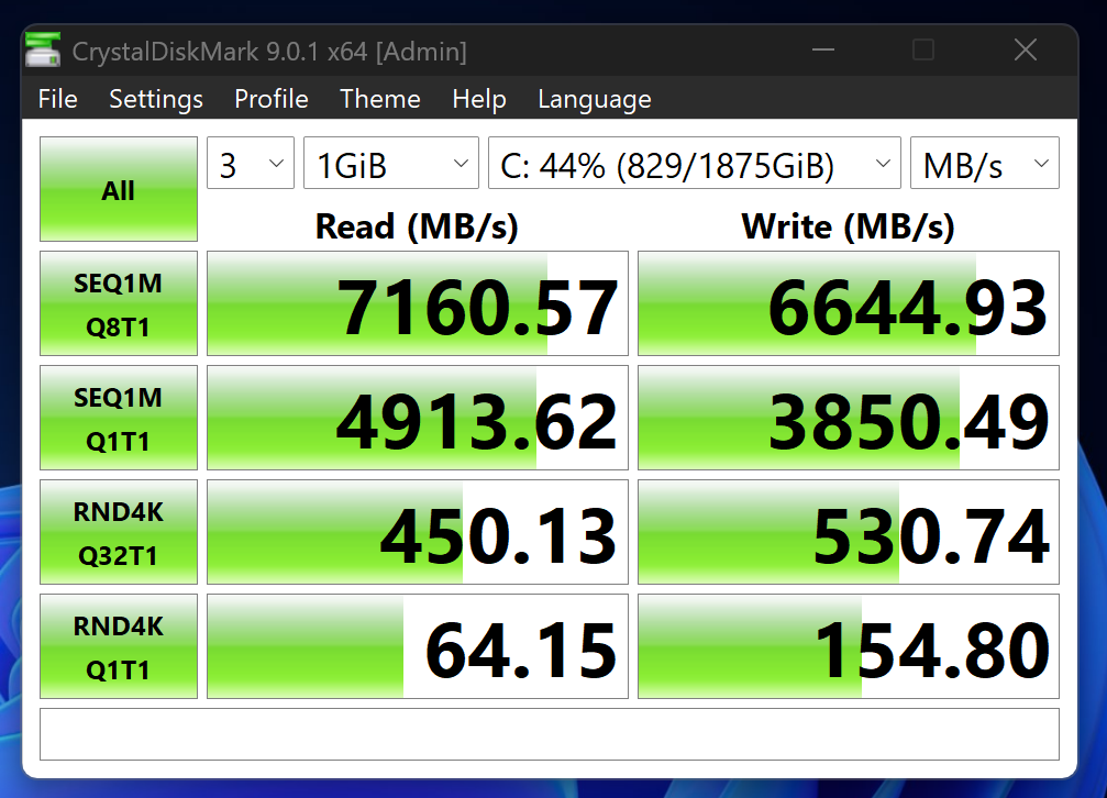 SSD-ul produs de Sk HyniX ofera performante excelente in testele noastre, cu peste 7100 MB/s viteza de citire, respectiv peste 6600 MB/s viteza de scriere, adica performante similare cu ceea ce vedem in cazul unui SSD PCI-E 4.0 montat pe o platforma desktop.