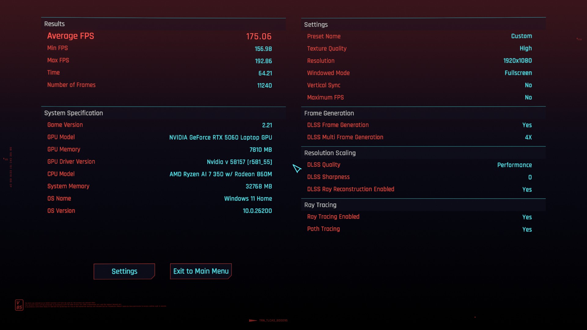 In Cyberpunk 2077 obtinem 43 fps pentru RTX 5060 Mobile, respectiv 91 fps pentru RTX 5080 Mobile, folosind setarile de pe platforma de teste pentru placi grafice. Crescand calitatea la maxim, inregistram 21 fps pentru RTX 5060 Mobile, respectiv 43 fps pentru RTX 5080 Mobile, cu DLSS dezactivat. In momentul in care activam DLSS 4 si Multi Frame Generation, media creste la 175 fps pentru RTX 5060 Mobile, respectiv 328 fps pentru RTX 5080 Mobile!