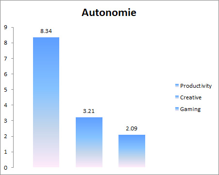 Pentru a evalua autonomia am testat mai intai un scenariu de utilizare indelungata (Productivity din PowerMark) cu profilul Power Saver in Windows, luminozitate 50% si Wi-Fi on. Acest test simuleaza tipul de lucru office prin browsing si aplicatii office (Word, Excel). Apoi am rulat PCMark 8 Creativity, cu luminozitatea 100%, profil High Performance si WiFi On. Nu in ultimul rand, m-am jucat World Of Tanks cu aceleasi setari. Toate testele au fost lansate cu bateria la 100%, finalizarea testului facandu-se in momenul in care bateria se descarca in proportie de 81-84%.