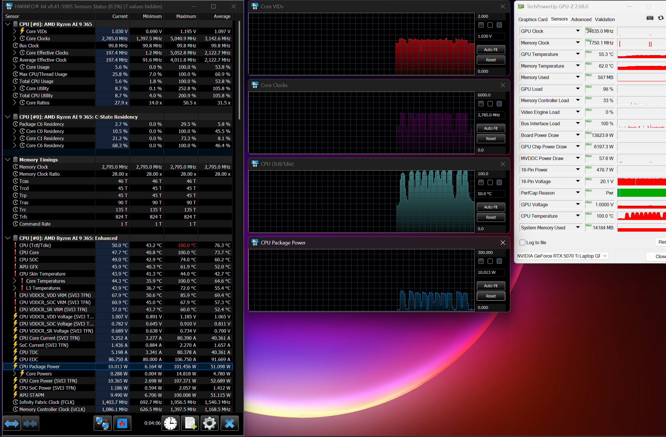 Acer Nitro 18 AI este in esenta un desktop replacement, deci autonomia nu este unul din punctele sale forte, laptop-ul oferind peste 3 ore de lucru, respectiv peste 2 ore de gaming departe de priza. Ce ne intereseaza insa in acest caz este performanta sistemului de racire, acesta fiind destul de zgomotos in modul Turbo, cu un nivel sonor maxim masurat de 53.8 dB.