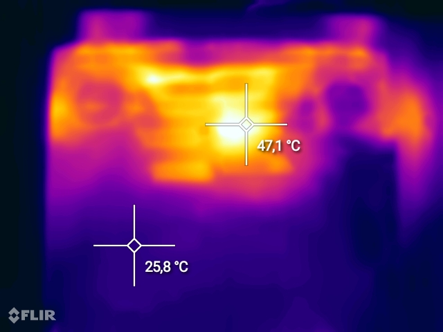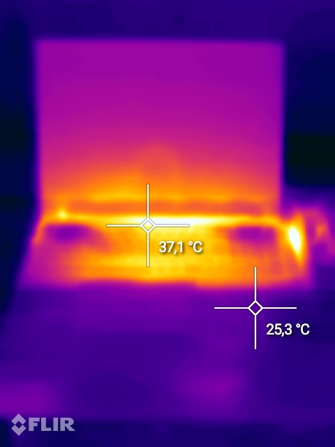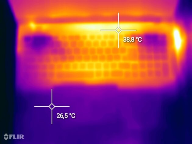 Temperatura procesorului atinge 100 oC dupa rularea suitei de teste, respectiv 95 oC dupa o sesiune prelungita de gaming. Nucleul placii grafice atinge un maxim de 71 oC, in timp ce temperatura exterioara a notebook-ului se apropie de 50 oC in cele mai fierbinte puncte, cu alte cuvinte, sistemul de racire ofera performante medii, ceea ce nu ar trebui sa ne mire, in conditiile in care nu avem de-a face cu tehnologii avansate, cum ar fi vapour chamber.