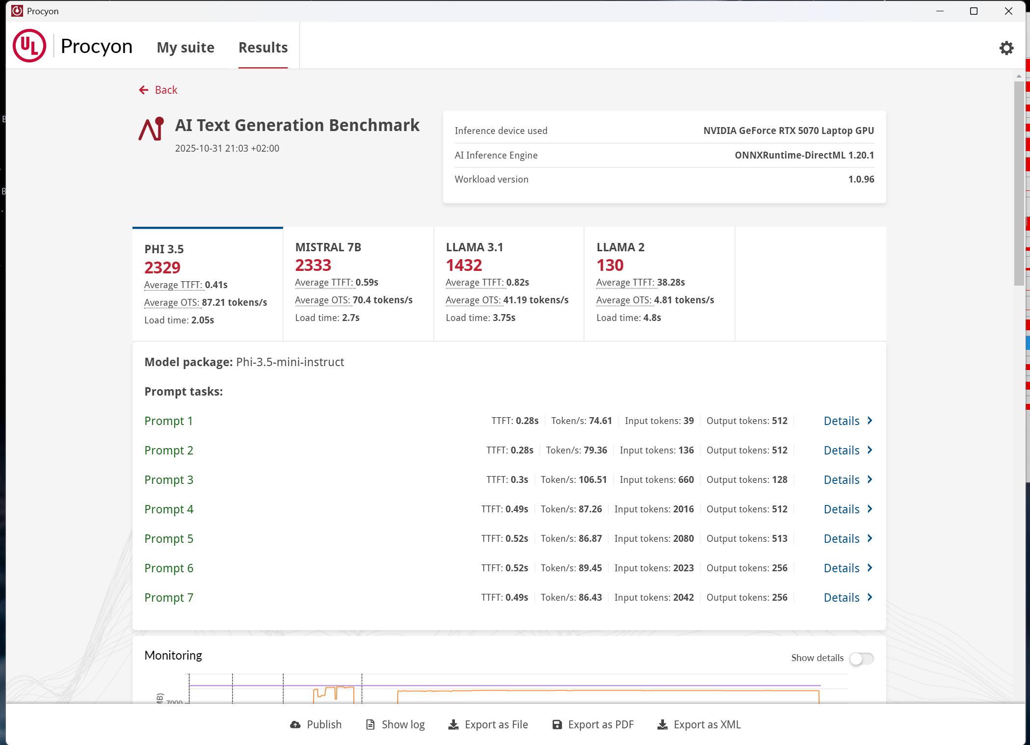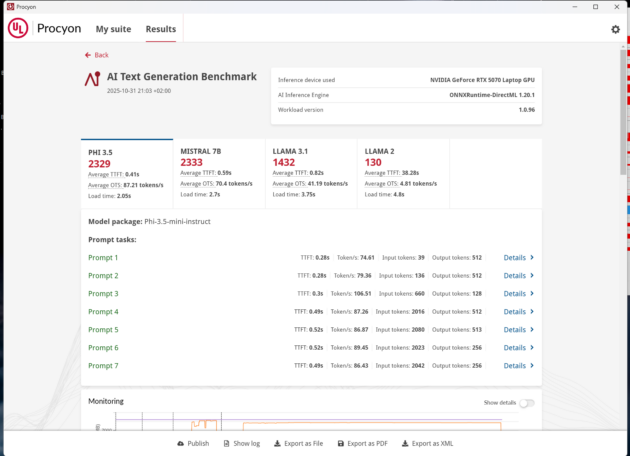 Am folosit pentru teste aceleasi aplicatii si aceleasi setari ca si in cazul metodologiei dedicate placilor grafice pentru desktop, de la editare video sau grafica 3D si pana la utilizarea LLM’s in cadrul aplicatiilor AI. Si aici intalnim aceeasi situatie ca si in cazul performantei in jocuri, RTX 5070 Mobile oferind performante similare cu RTX 4060 / RTX 5060 desktop, in functie de situatie.