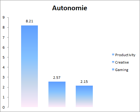 Pentru a evalua autonomia am testat mai intai un scenariu de utilizare indelungata (Productivity din PowerMark) cu profilul Power Saver in Windows, luminozitate 50% si Wi-Fi on. Acest test simuleaza tipul de lucru office prin browsing si aplicatii office (Word, Excel). Apoi am rulat PCMark 8 Creativity, cu luminozitatea 100%, profil High Performance si WiFi On. Nu in ultimul rand, m-am jucat World Of Tanks cu aceleasi setari. Toate testele au fost lansate cu bateria la 100%, finalizarea testului facandu-se in momenul in care bateria se descarca in proportie de 81-84%.
