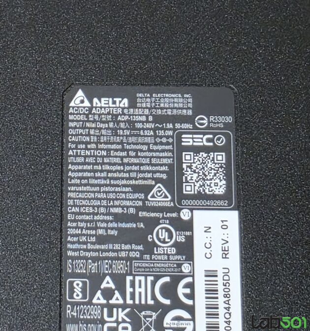 Acer Nitro V 16 AI este livrat intr-un ambalaj din carton reciclabil, in care gasim alimentatorul la priza Delta Electronics de 135W, cablul aferent si un ghid rapid.