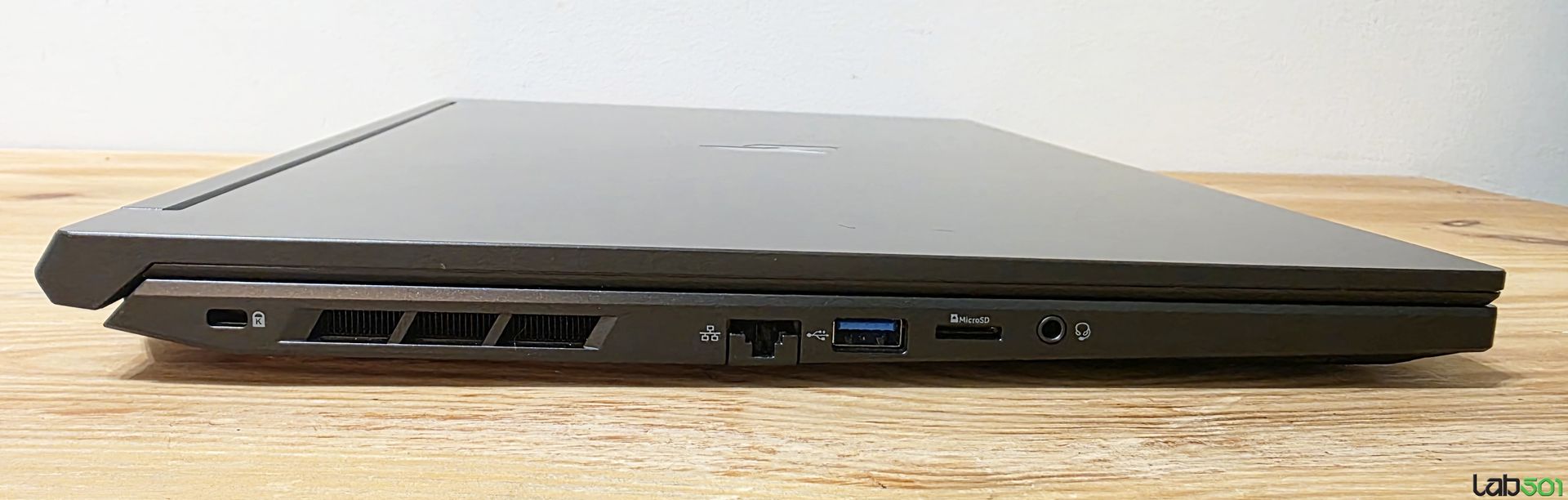 Discutam despre un notebook de dimensiuni medii (360 x 275.6 x 24.5 mm), care cantareste 2.44Kg, calitatea constructiei fiind destul de buna, tinand cont de materialele utilizate. Dispunerea conectorilor este familiara, conectorul alimentatorului, conectorul HDMI si conectorul USB-C fiind dispuse pe latura din spate.