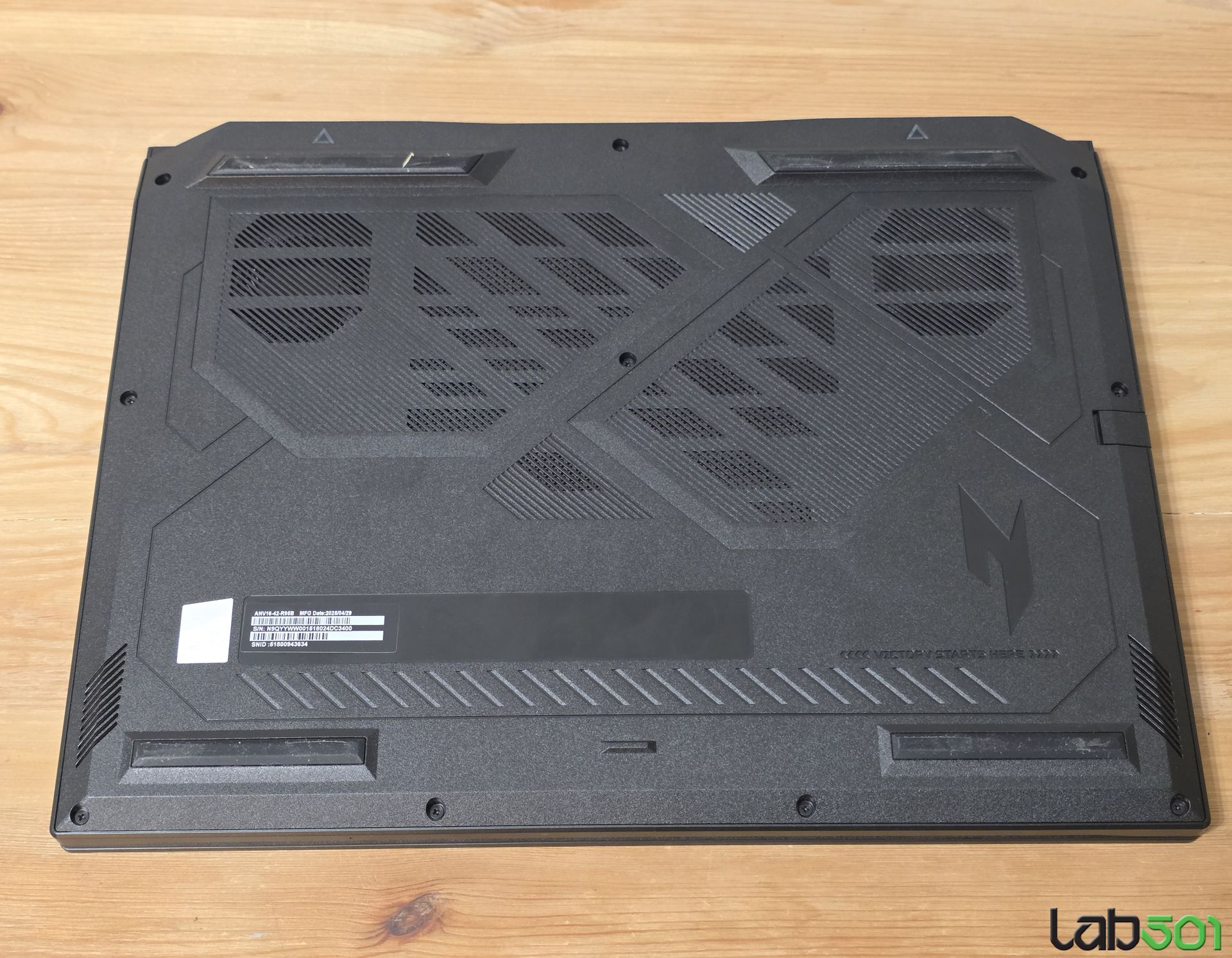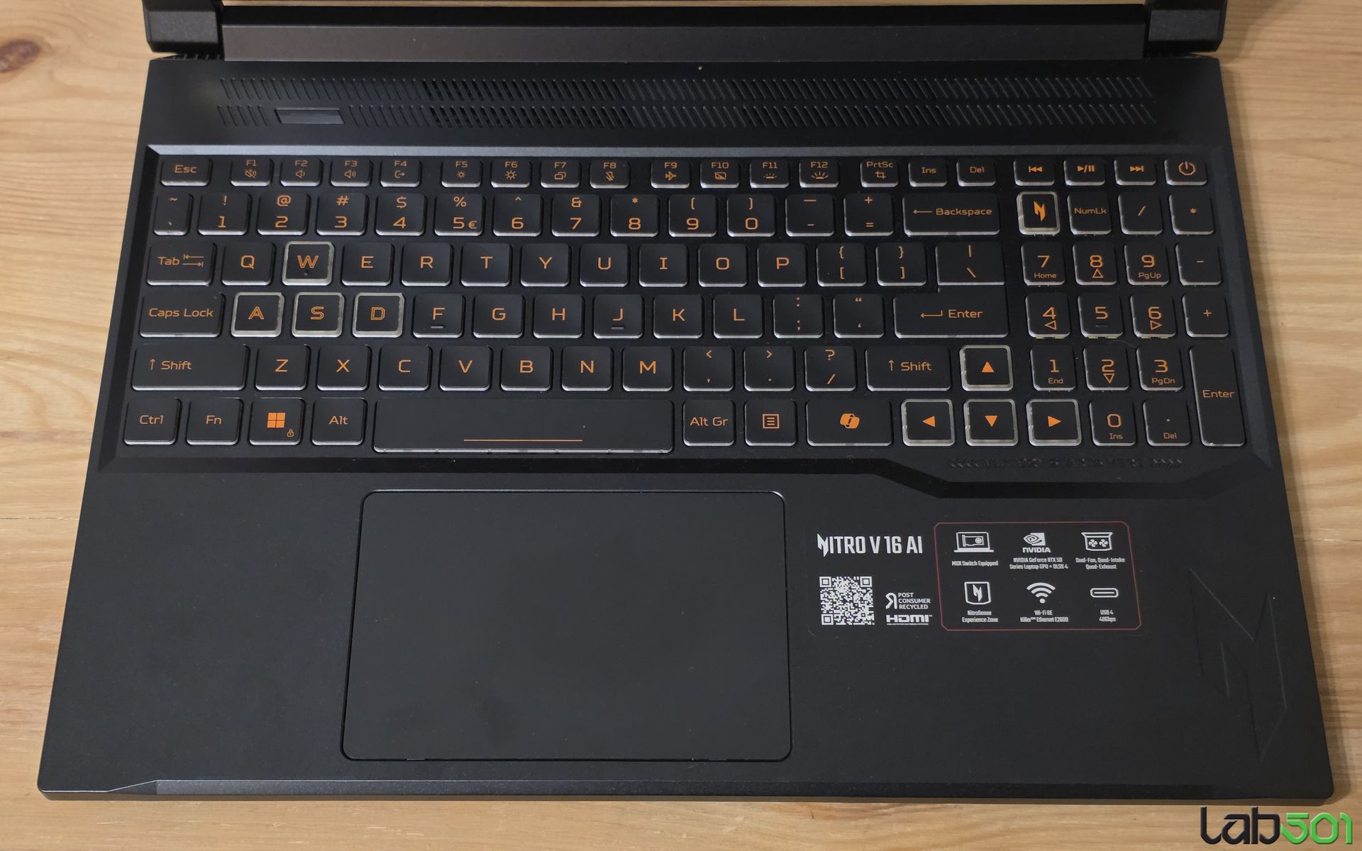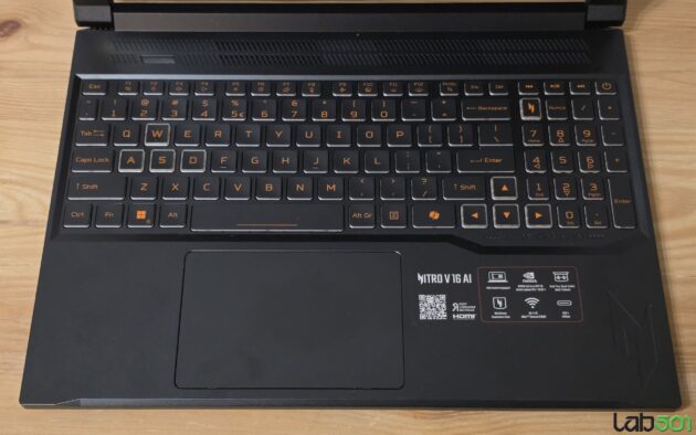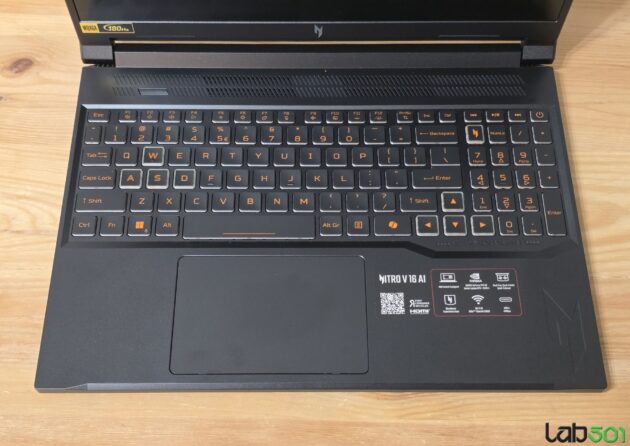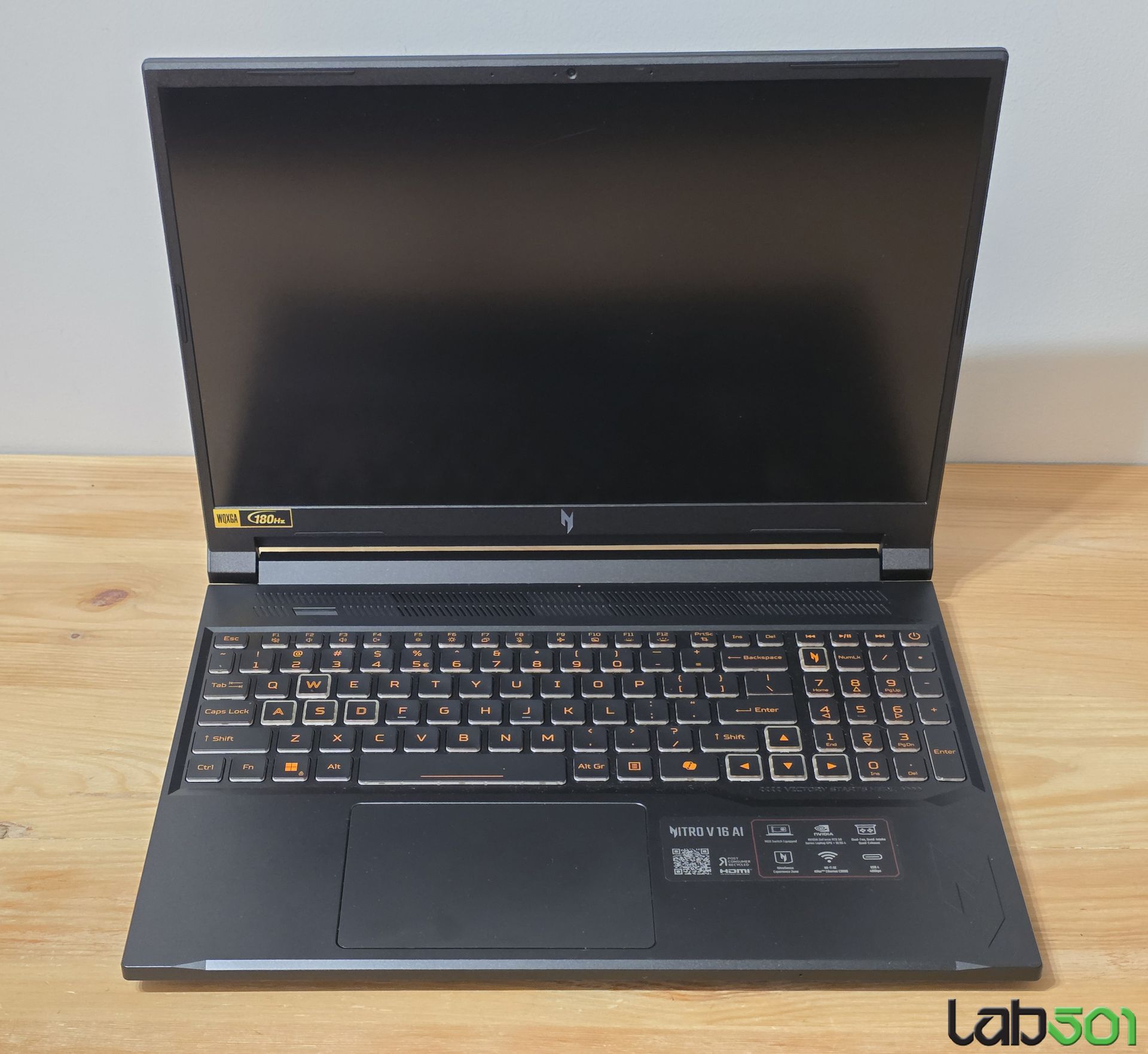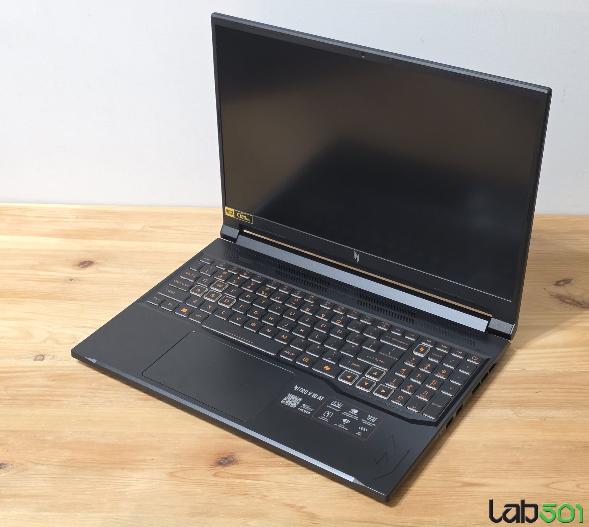 Acer Nitro V 16 AI este construit integral din plastic, avand un aspect elegant cand este inchis, respectiv un limbaj estetic agresiv, de gaming, in momentul in care il deschidem, tastatura fiind iluminata placut, in nuante de portocaliu.