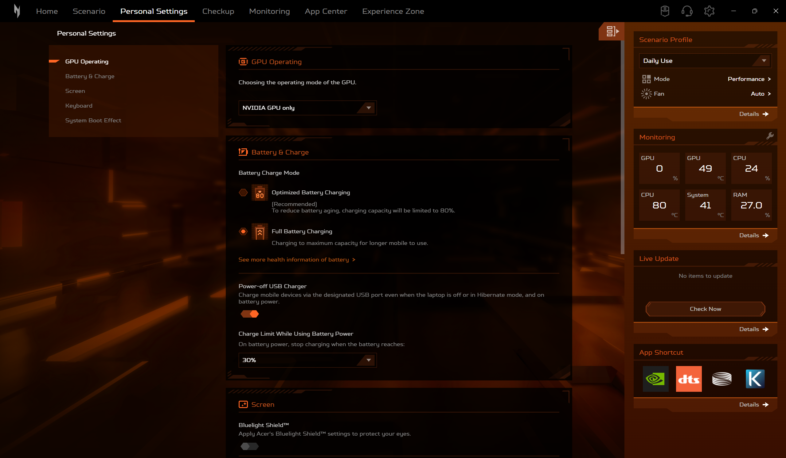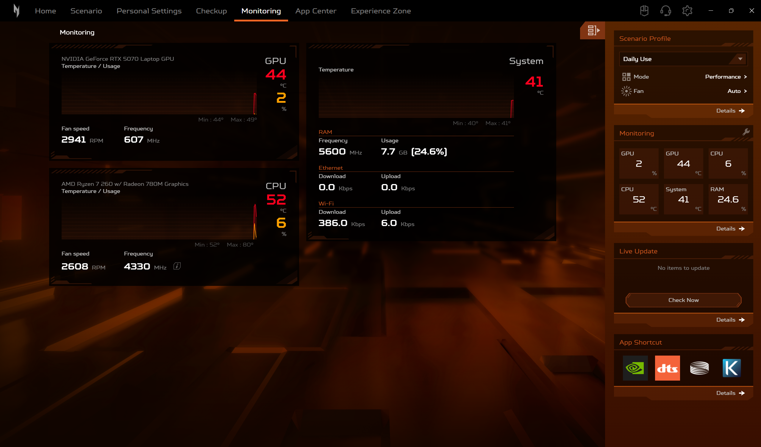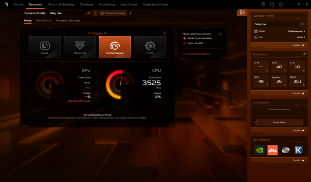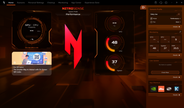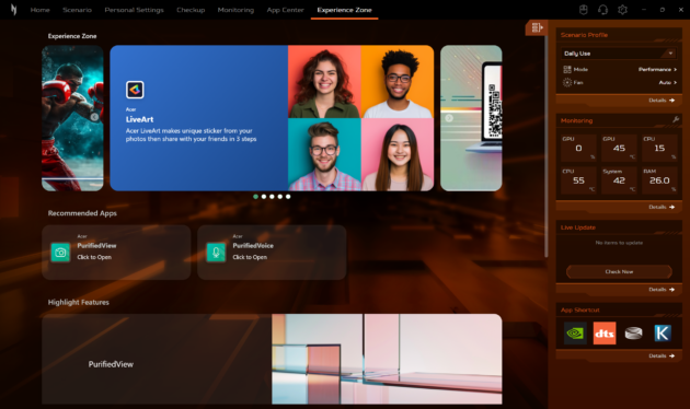 Daca modelele din seria Predator sunt echipate cu utilitarul Predator Sense, Acer Nitro V 16 AI este echipat, evident, cu utilitarul Nitro Sense. Acesta ne ofera posibilitatea de a alege intre mai multe profile de performanta, de a controla manual viteza de rotatie a ventilatoarelor sau de a controla si personaliza iluminarea RGB. Tot aici gasim si asa numitul Experience Zone, de unde putem lansa mai multe aplicatii, cu ajutorul carora putem genera fundaluri AI sau putem imbunatati experienta de utilizare a camerei web.