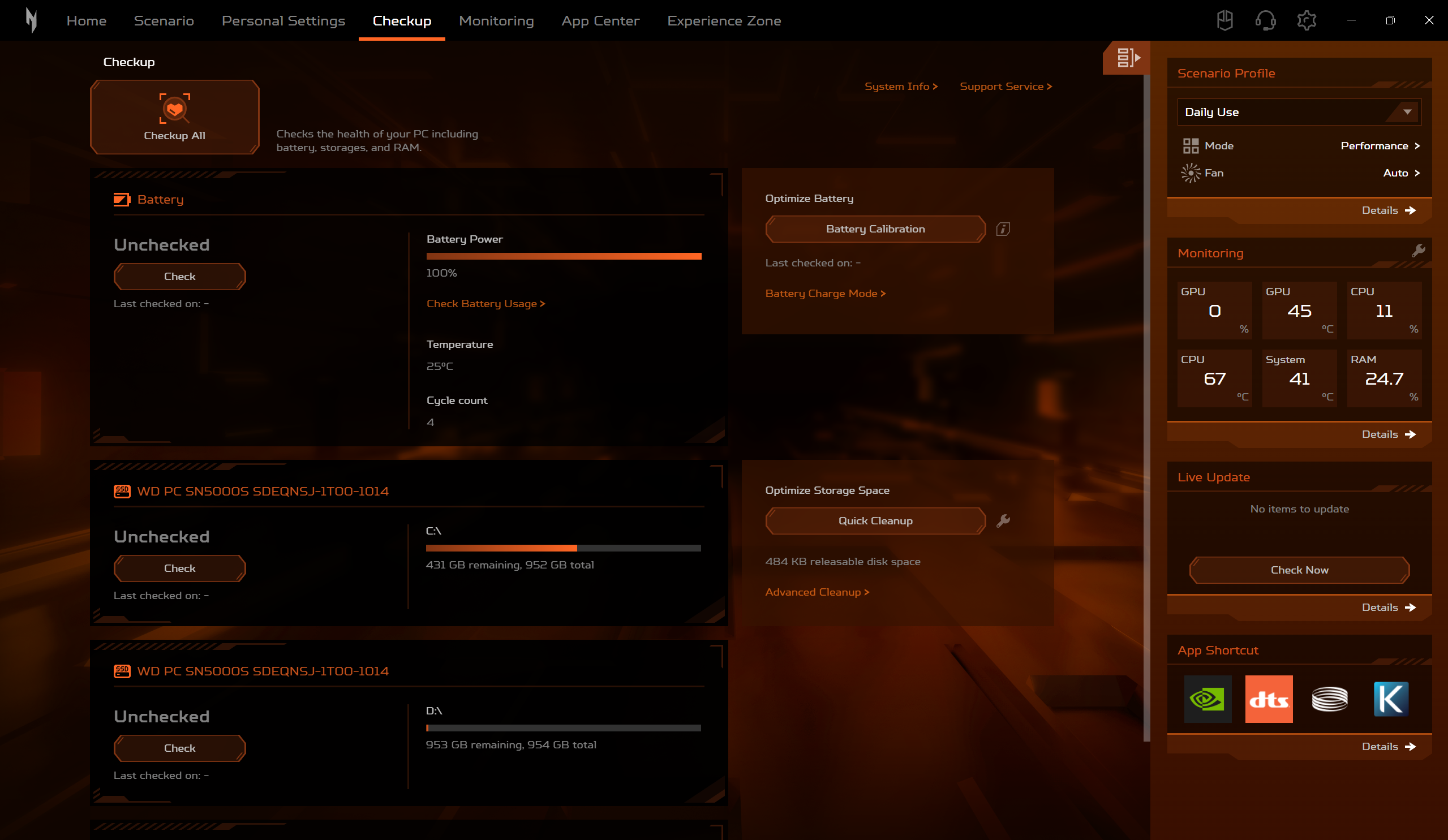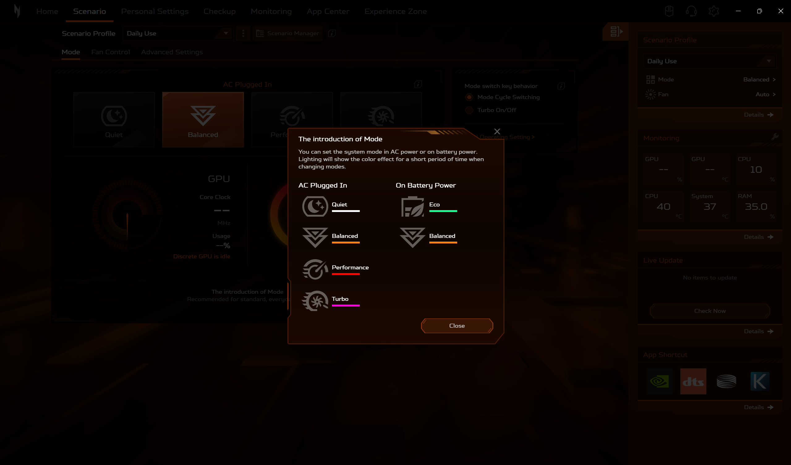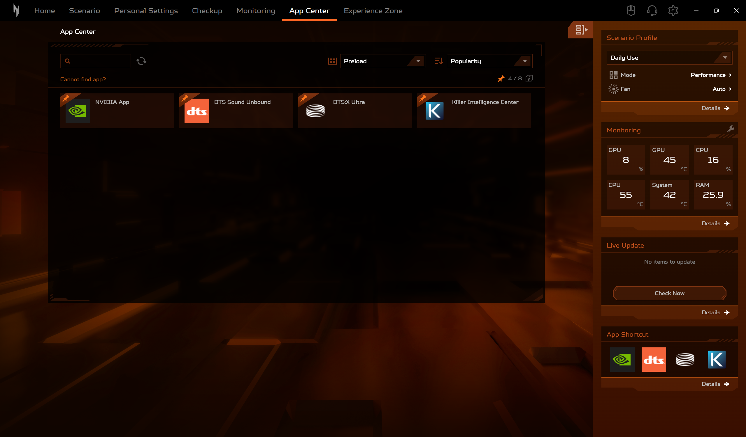 Daca modelele din seria Predator sunt echipate cu utilitarul Predator Sense, Acer Nitro V 16 AI este echipat, evident, cu utilitarul Nitro Sense. Acesta ne ofera posibilitatea de a alege intre mai multe profile de performanta, de a controla manual viteza de rotatie a ventilatoarelor sau de a controla si personaliza iluminarea RGB. Tot aici gasim si asa numitul Experience Zone, de unde putem lansa mai multe aplicatii, cu ajutorul carora putem genera fundaluri AI sau putem imbunatati experienta de utilizare a camerei web.
