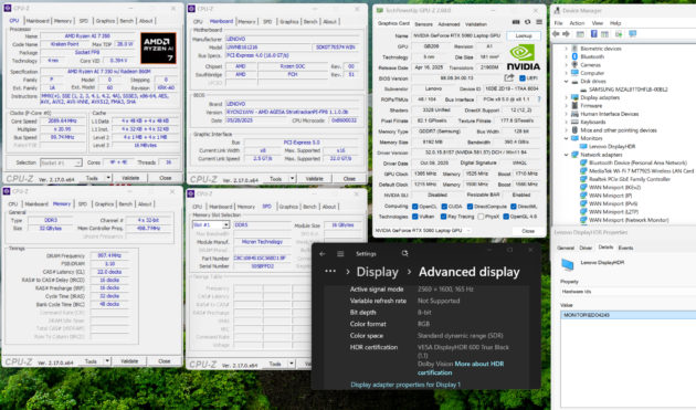 Procesorul este secondat de 32GB DDR5 5600 CL46 produsi de Micron, precum si de un SSD Samsung PCI-E 4 de 1TB. Nu in ultimul rand, Lenovo Legion 5 15AKP10 este echipat cu o placa grafica Nvidia GeForce RTX 5060 Mobile, cu un TDP de 115W.