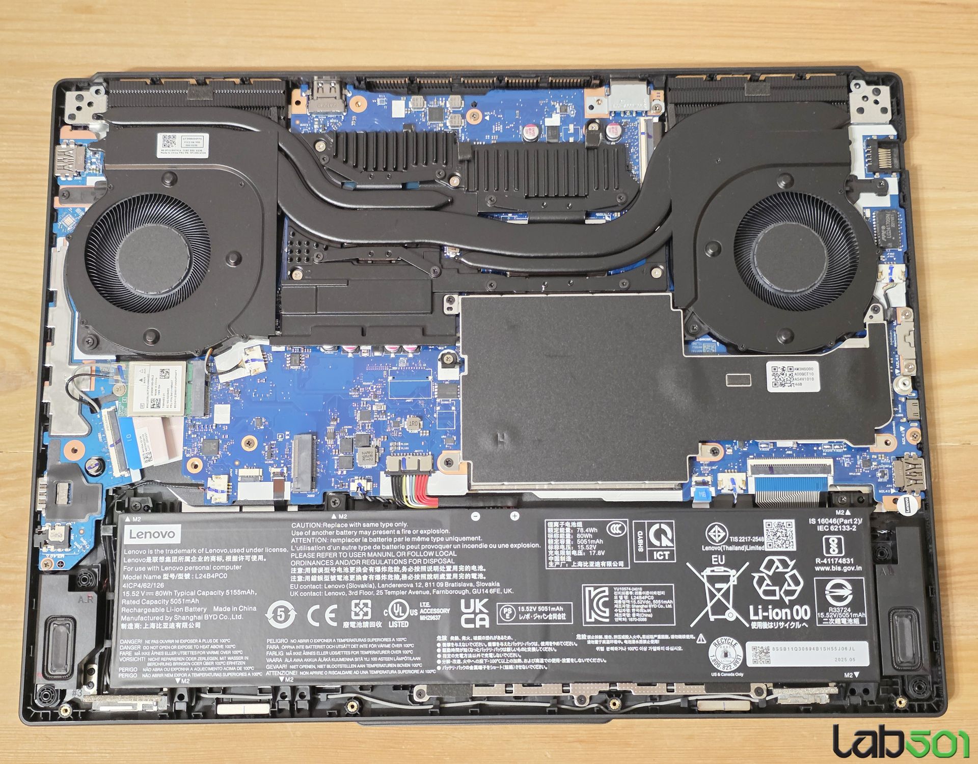 Cea mai importanta tehnologie utilizata de Lenovo in cazul intregii serii Legion 2025, inclusiv LOQ, este deja binecunoscutul hyperchamber, Lenovo folosind principii de directionare a aerului, intalnite de obicei in carcasele de PC. Astfel, zona mediana a laturii inferioare este obturata, pe sistemul de racire si pe latura inferioara fiind lipite insertii de burete elastomeric, luand astfel nastere 3 camere distincte (hyperchamber), care stau la baza principiului de functionare din spatele sistemului de racire Lenovo Coldfront Hyper.