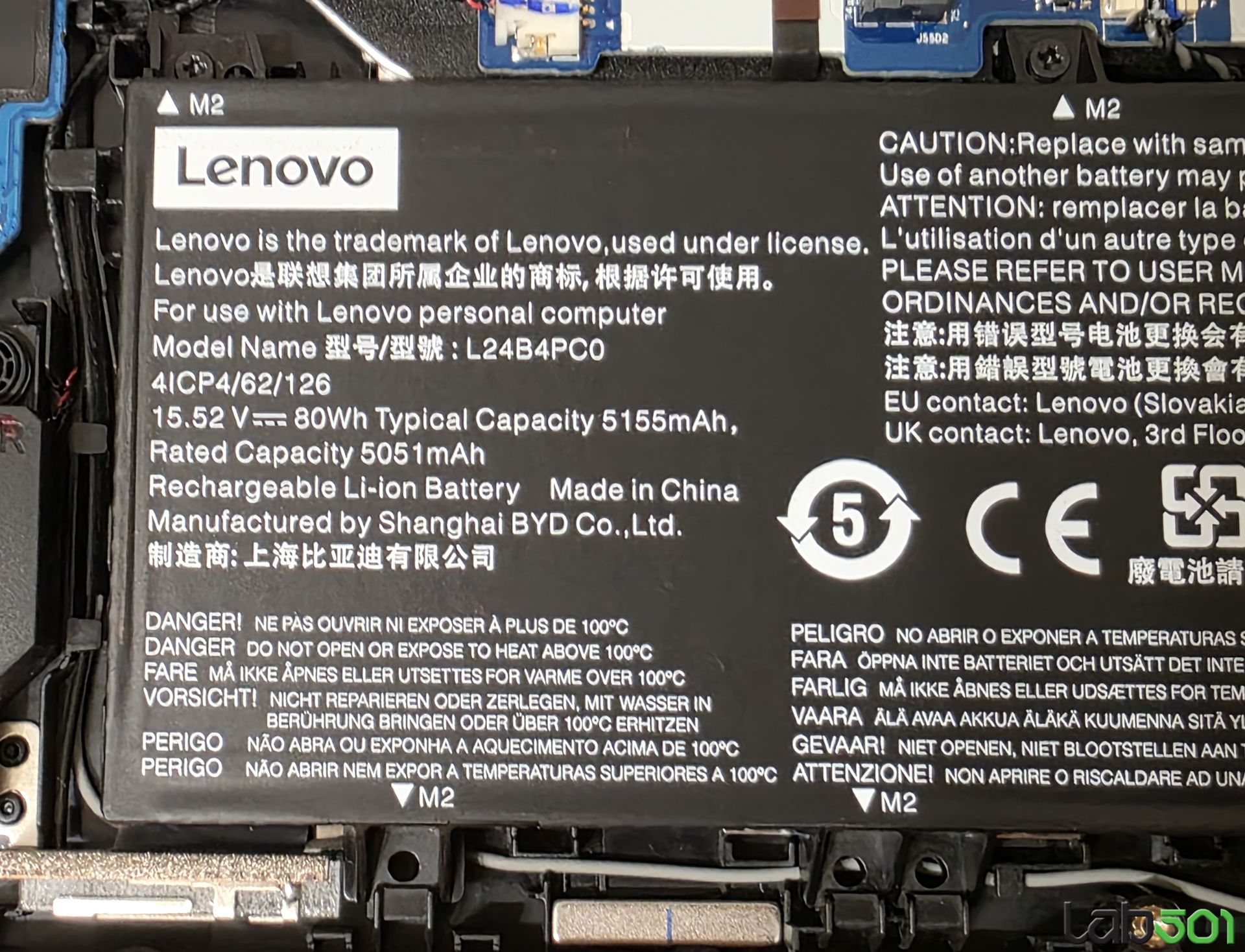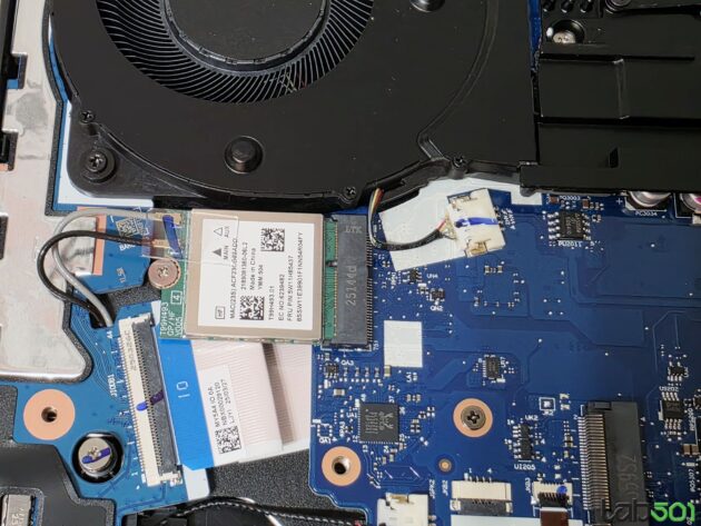 Lenovo Legion 5 15AKP10 este echipat cu doua slot-uri SO-DIMM, memoria putand fi schimbata cu usurinta, respectiv doua slot-uri M.2 2280, numai unul fiind populat in cazul de fata. Atat memoriile, cat si SSD-ul, sunt acoperite cu o folie speciala, care ajuta la disiparea caldurii produse de IC-uri.