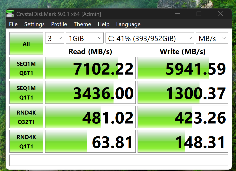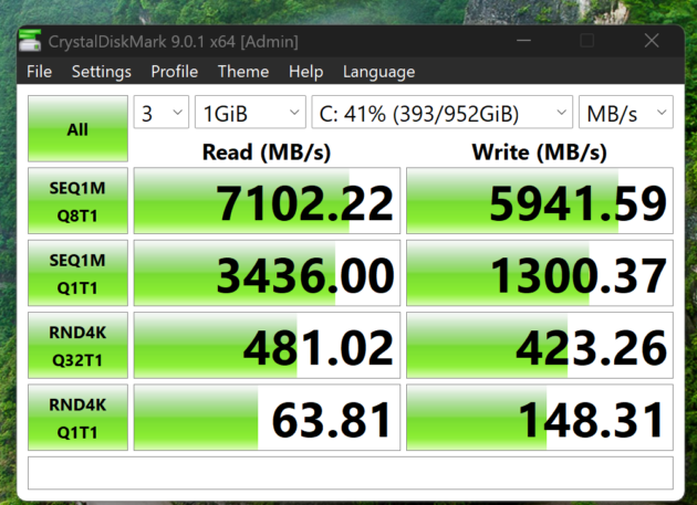 SSD-ul produs de Samsung ofera performante excelente in testele noastre, cu peste 7100 MB/s viteza de citire, respectiv 5941 MB/s viteza de scriere, adica performante similare cu ceea ce vedem in cazul unui SSD PCI-E 4.0 montat pe o platforma desktop.