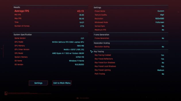 Putem rula fara probleme CS2 sincron cu rata de refresh a monitorului, laptopul nostru inregistrand un framerate mediu de peste 205 de cadre pe secunda. Desigur, nu putem discuta despre jucabilitate cu toate tehnologiile de raytracing activate. Aici intervine insa DLSS 4, cu ajutorul caruia putem sa ne jucam Cyberpunk 2077 cu cele mai ridicate setari, in conditii optime.