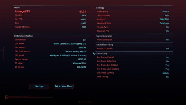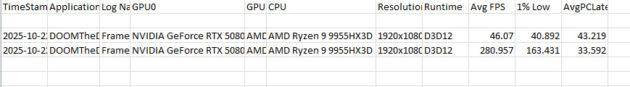In momentul in care impingem toate setarile la maxim si activam DLSS 4, RTX 5080 Mobile obtine un framerate mediu de 270 fps in DOOM The Dark Ages si 297 fps in Cyberpunk 2077 pe platforma Intel, respectiv 281 fps si 328 fps pe platforma AMD. Practic, in rezolutie FullHD, RTX 5080 Mobile in combinatie cu AMD Ryzen 9 9955HX3D ofera o performanta similara cu RTX 5090 Mobile in combinatie cu Intel Core Ultra 9 275HX.