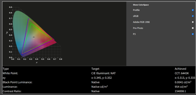 Lenovo Yoga Pro 9i Aura Edition este echipat cu un panou tactil OLED produs de Samsung, cu o rata de refresh de 120Hz si o rezolutie 3200 x 2000, acesta oferind 100% acoperire pentru spatiul de culoare DCI-P3. Panoul ofera rezultate excelente, cu un nivel de alb de 954 cd/m2 si un contrast absolut, reproducerea culorilor (Delta E mediu 0.4), respectiv uniformitatea, fiind impresionante. Practic, display-ul PureSight Pro ofera o experienta vizuala superba, fiind unul dintre cele mai performante panouri montate pe un notebook pana in momentul de fata!