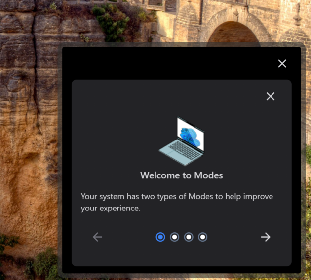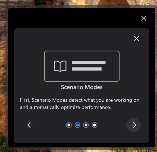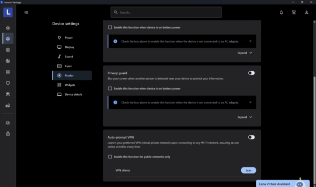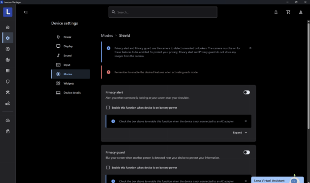 Acestea, impreuna cu profilele de performanta, pot fi accesate rapid cu ajutorul Vantage Widget, accesibil prin apasarea tastei F9. Shield Mode foloseste algoritmi AI care detecteaza prezenta altor persoane in jurul nostru, folosind camera web, notificandu-ne de prezenta acestora (Privacy Alert) si blurand imaginea de pe ecran (Privacy Guard). De asemenea, tot in acest mod, daca ne conectam la retele WiFi publice, din afara biroului nostru, laptop-ul va activa automat aplicatia VPN instalata de noi.
