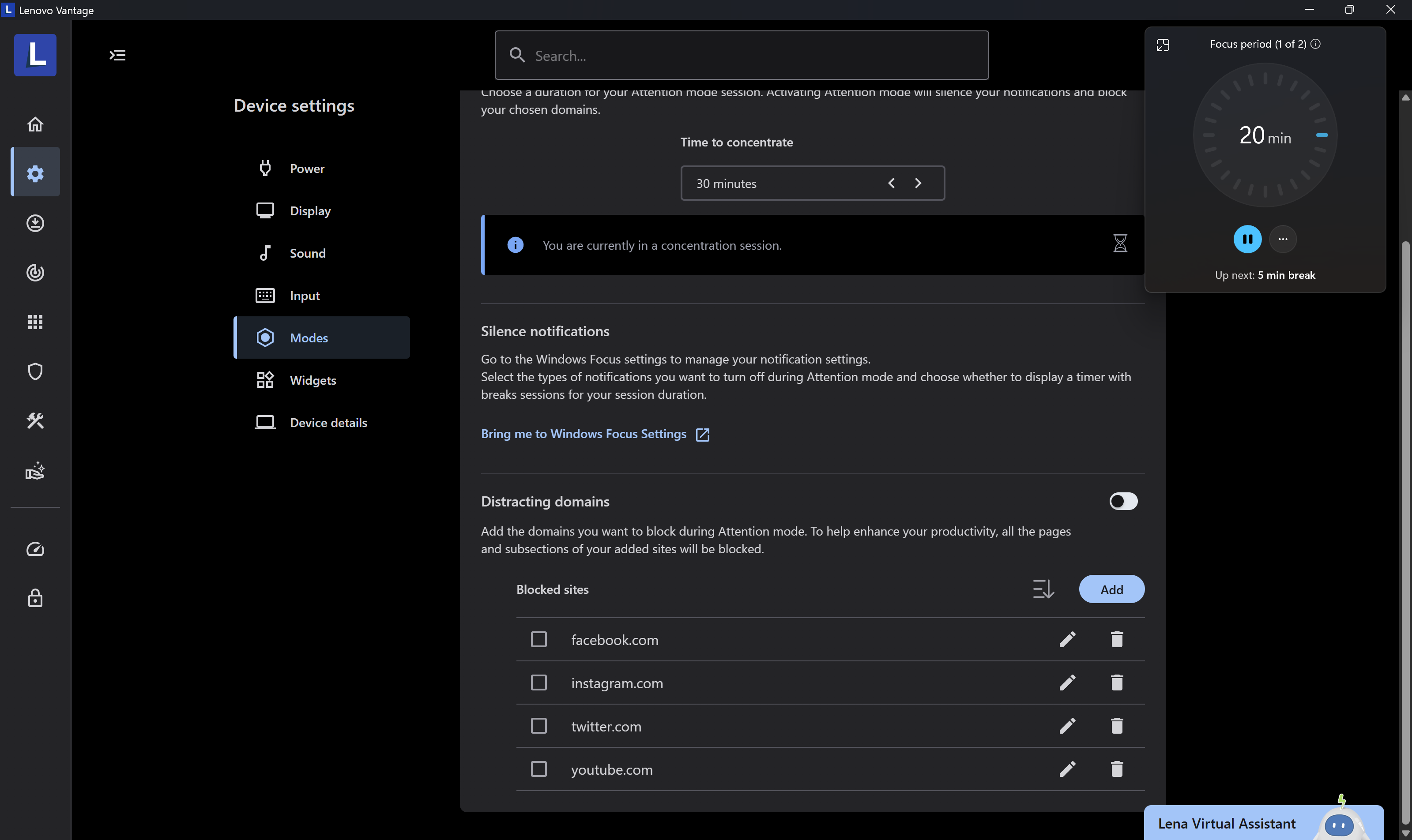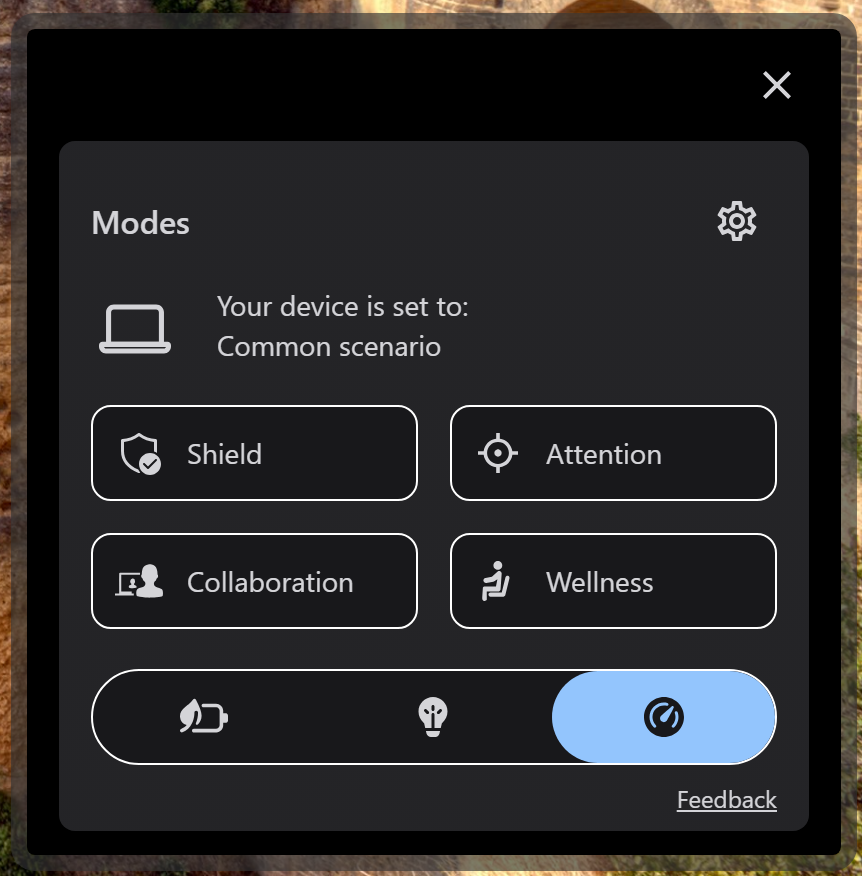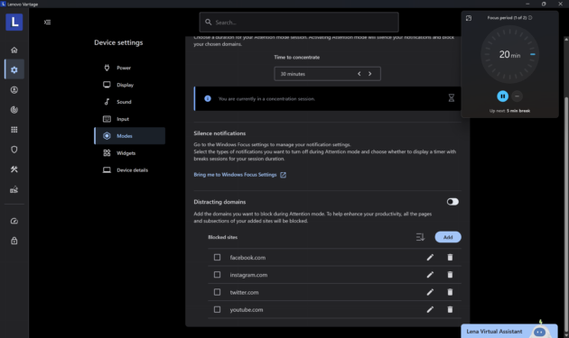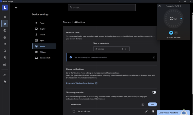 Modul Attention ne permite sa blocam notificarile pentru o perioada definita de noi, dar si sa blocam anumite domenii pe aceasta perioada (de exemplu Facebook, Instagram, YouTube). Modul Collaboration calibreaza automat webcam-ul pentru noi, alegand dintre fundalurile preferate si activand functii ca auto-frame, folosind de asemenea inteligenta artificiala pentru a imbunatati calitatea imaginii in conditii slabe de iluminare.