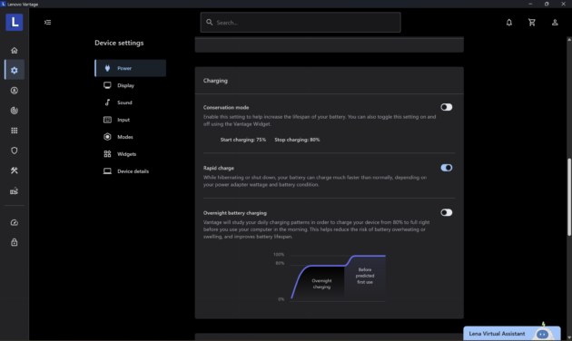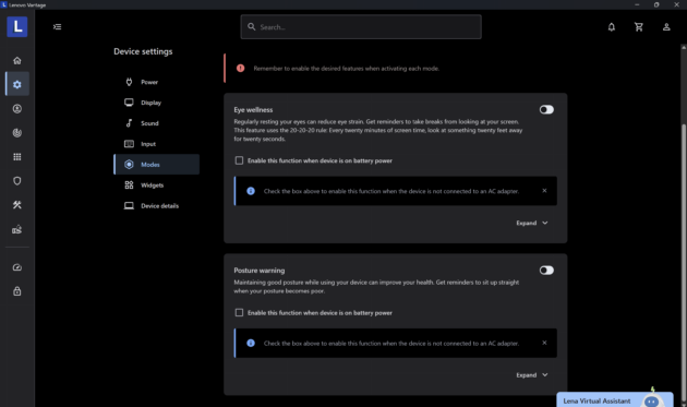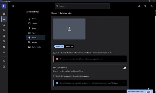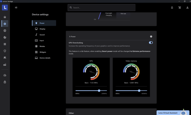 In modul performance, in Lenovo Vantage, avem la dispozitie si functia GPU Overclocking, activata implicit pe modelele echipate cu placa grafica dedicata. Pe langa clasicele profile de performanta, Smart Modes ofera si 6 scenarii de utilizare (Common, Media, Meeting, Gaming, Creative si Learning), fiecare cu setari specifice, respectiv 4 moduri inteligente, adica Shield, Attention, Collaboration si Wellness.