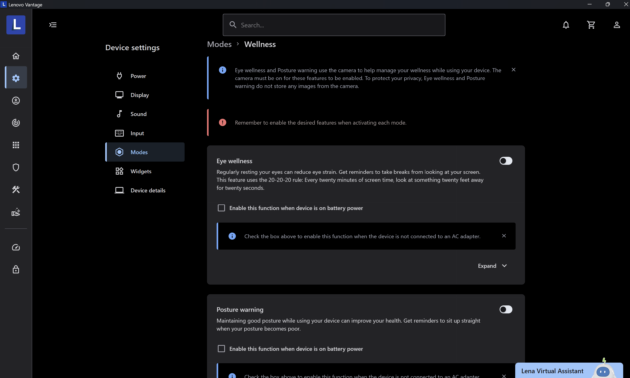 Nu in ultimul rand, modul Wellness ne reaminteste constant sa ne odihnim ochii, dar si sa ne ridicam din cand in cand de la calculator pentru a ne imbunatati postura. Avem de asemenea si optiuni avansate de partajare de fisiere intre telefon (Android sau iOS) si laptop, acesta folosind ceea ce Lenovo numesc AI Virtual Smart Sensor pentru a conecta telefonul la PC printr-o simpla atingere.