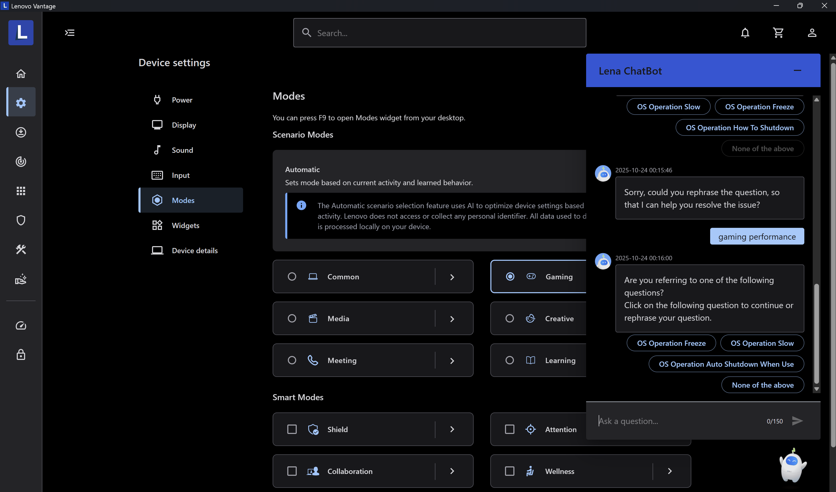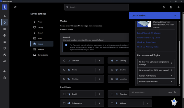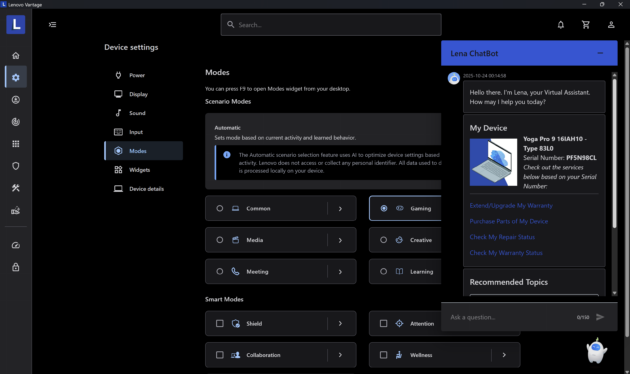 La randul sau, Smart Care se refera la asistentul AI Lena, cu ajutorul careia avem acces la diverse functii de suport virtual, legate de garantie, upgrade-uri si multe altele. Practic, inainte de a ajunge sa folosim functiile Lenovo Premium Care, putem apela la asistentul virtual pentru suport.