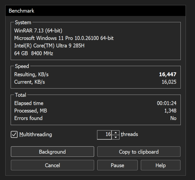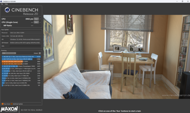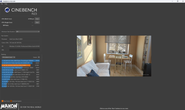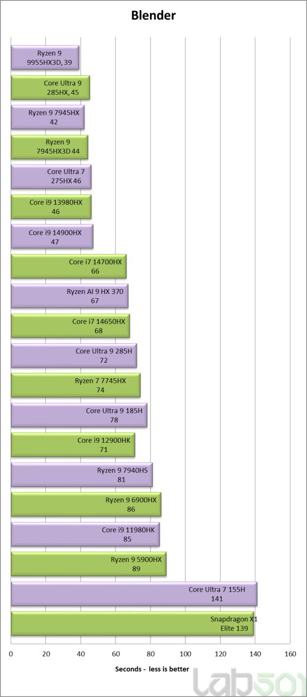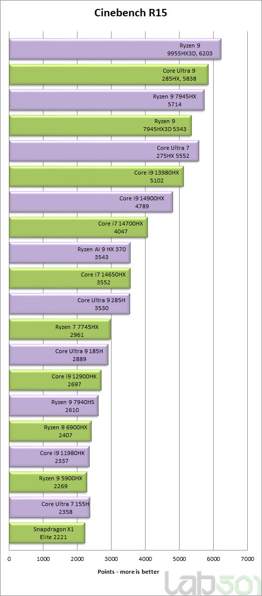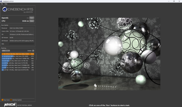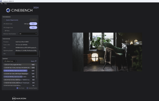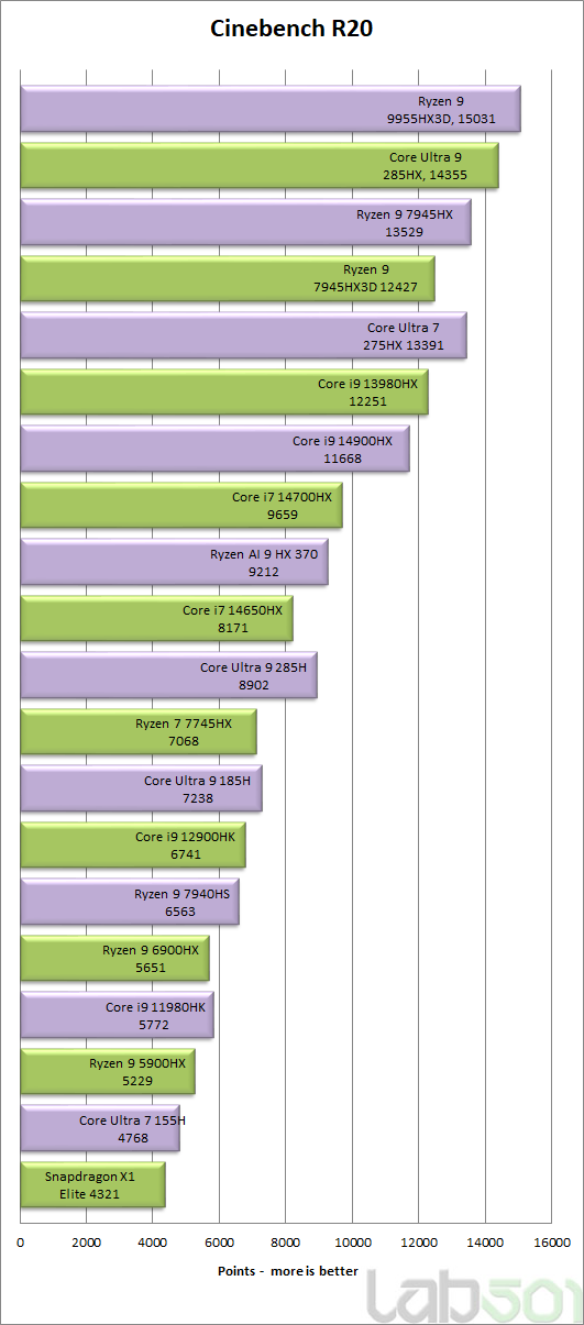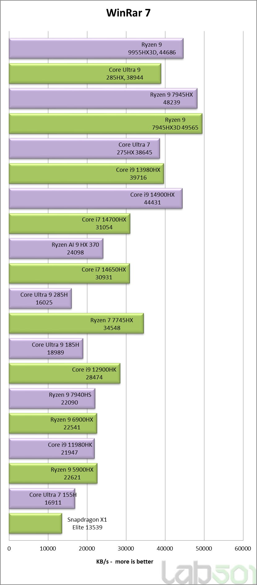 Intel Core Ultra 9 285H are un TDP de baza de 45W, TDP-ul maxim (TDP Turbo PL2) fiind de 115W. Asta inseamna ca producatorii pot configura TDP-ul in functie de sistemul de racire, sau mai bine zis, in functie de laptop. Folosind profilul Performance (Fn+Q), observam un TDP mediu de 65W, rezultatele obtinute de noi fiind pozitionate intre Intel Core Ultra 9 185H si Intel Core i7 14650HX.