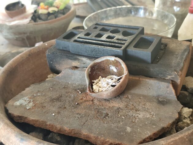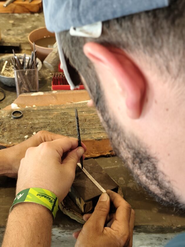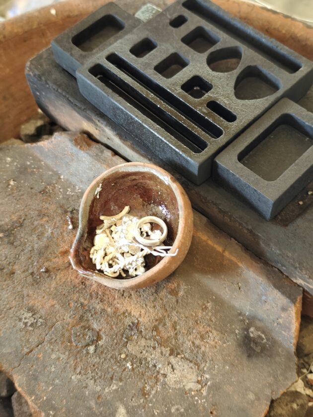 Totul incepe cu turnarea argintului in creuzet si incalzirea sa pana trece de punctul de topire, argintul fiind apoi turnat sub forma de lingou. Acesta este racit in apa si batut cu ciocanul pentru a-i schimba proprietatile fizice, devenind astfel mai dur. Ulterior, din lingoul de argint astfel obtinut, se taie cantitatile necesare pentru fiecare bijuterie. In cazul nostru, fiind 4 oameni, am primit 28g de argint.